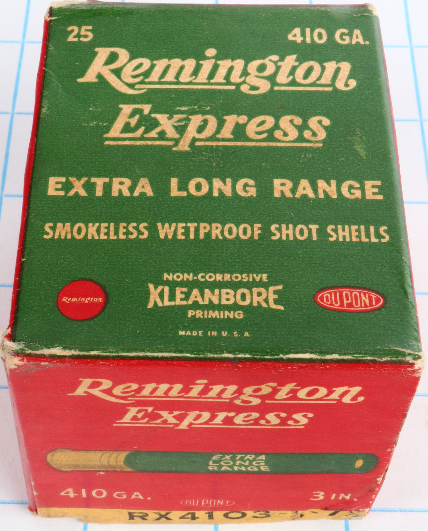 Remington Express, Extra Long Range, 410ga., 1pc., Full, shot size 7 1/2, red, white and green box, 3'', box bottom flap is torn with great colors, shells are excellent. Grade: Excellent - Value: 10 to 50