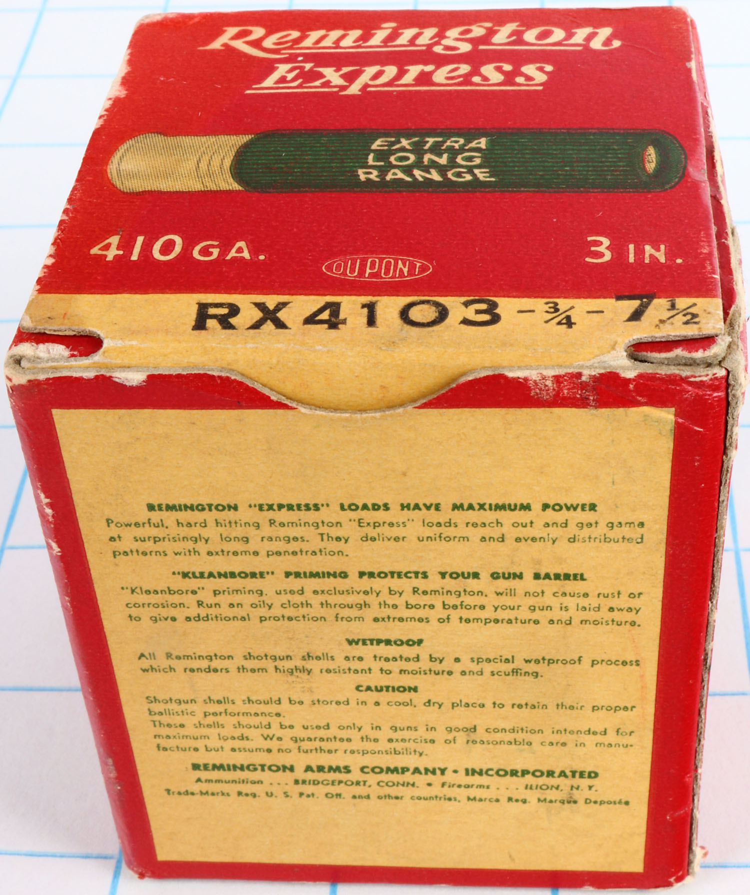 Remington Express, Extra Long Range, 410ga., 1pc., Partial 24rds with 1rd having different primer, shot size 7 1/2, red, white and green box, 3'', box bottom inside flap is torn with great colors, shells are excellent. Grade: Excellent - Value: 10 to 40