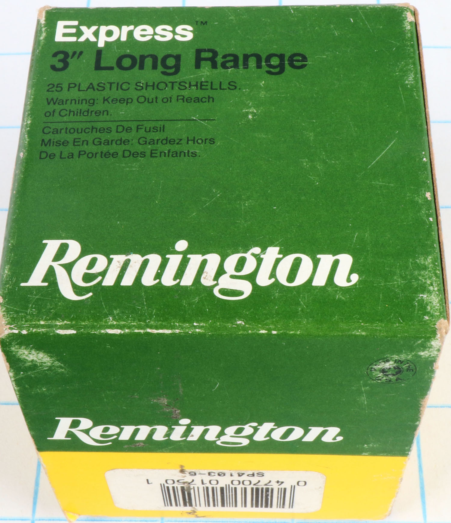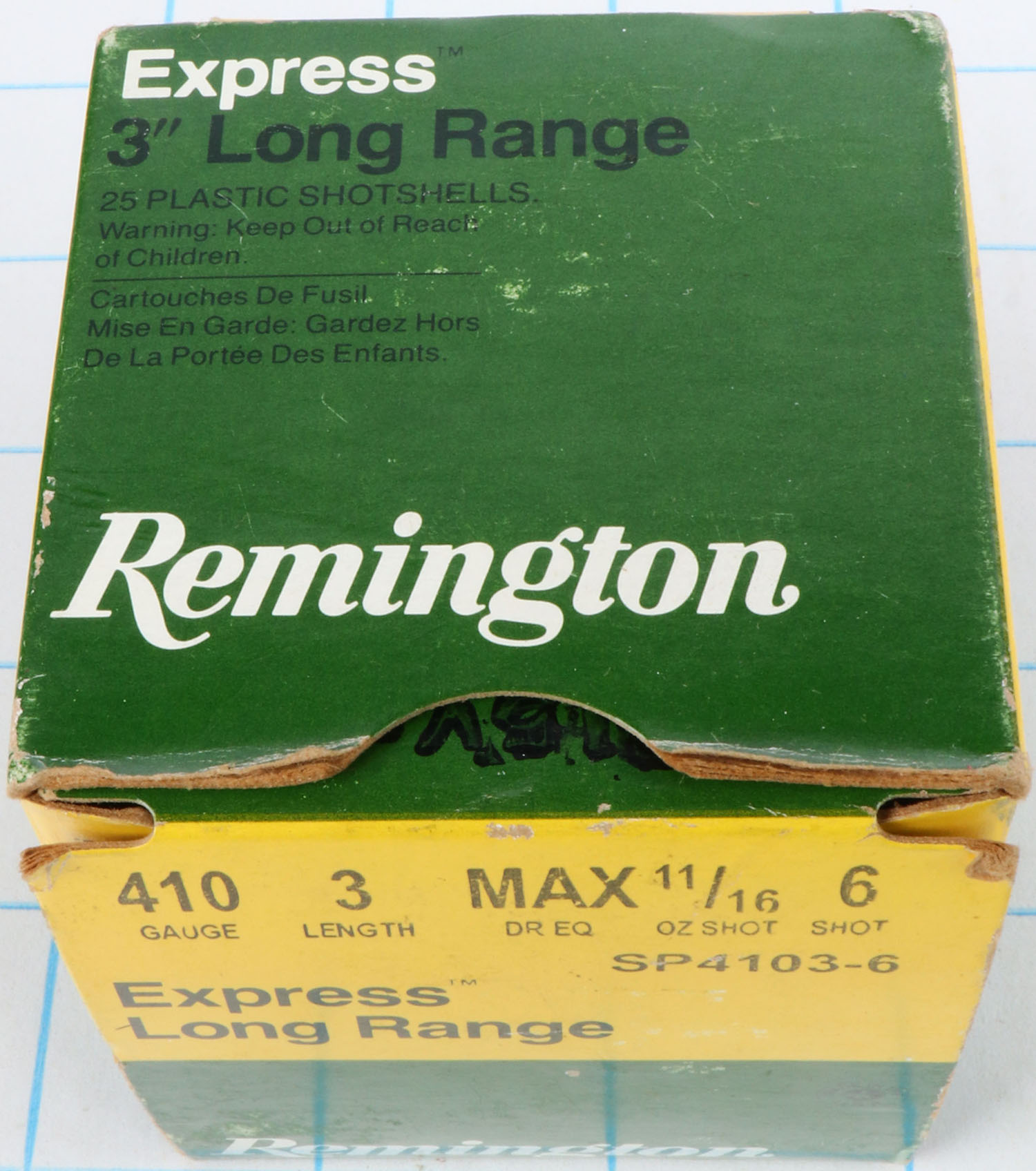 Remington Express, Long Range, 410ga., 1pc., Full, shot size 6, multi-colored box, shells are excellent. Grade: Excellent - Value: 10 to 20