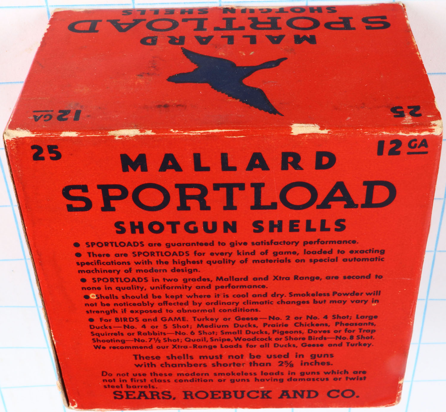 Sears, Sportload MALLARD with insert, 12ga., 1pc., Full, shot size 6 ch, red & blue box that pictures a Mallard in flight, box is solid with light soiling, light edge wear & great colors, shells are very good. Grade: Excellent - Value: 10 to 50