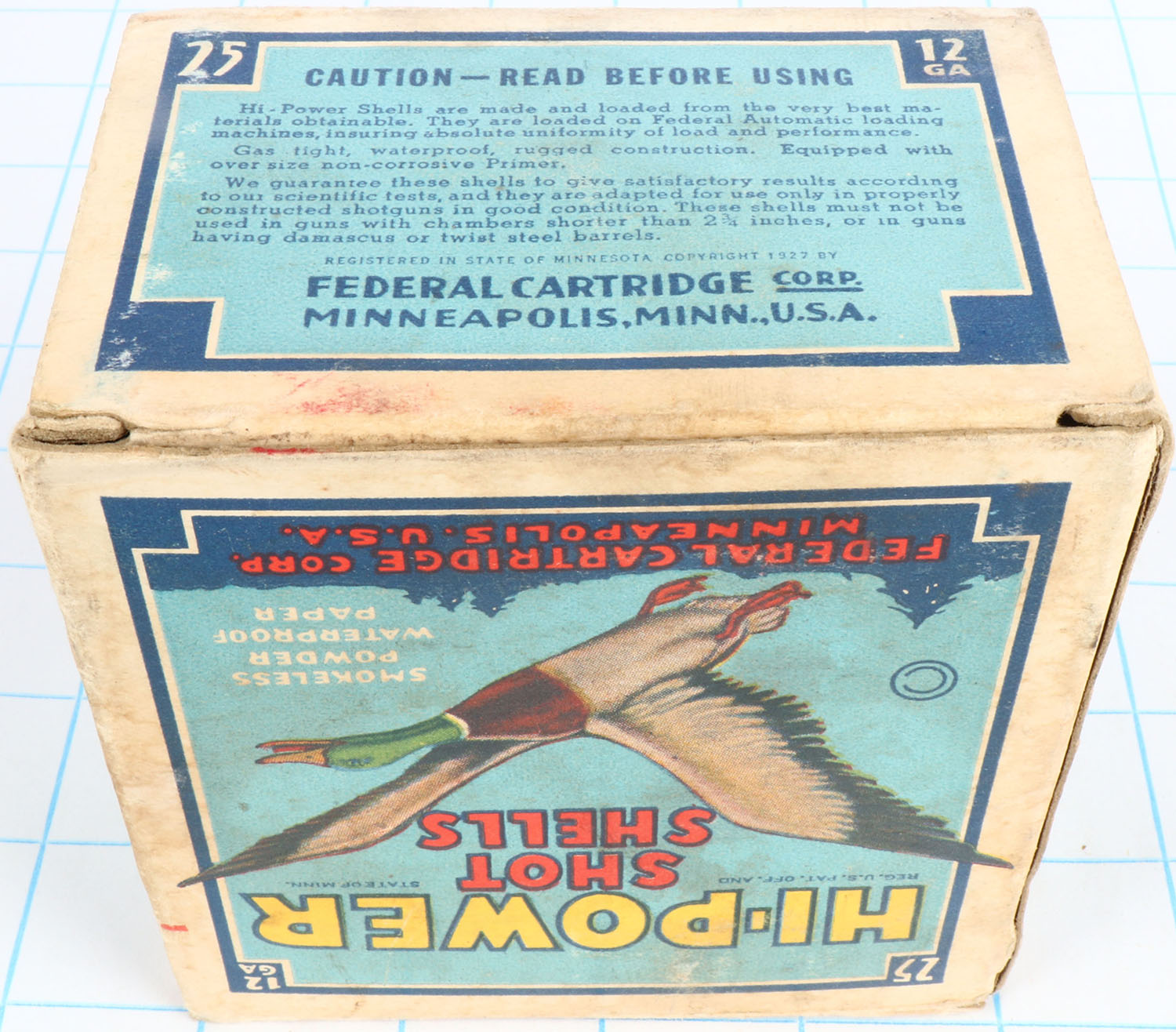 Federal Cart. Co., HI-POWER, 12ga., 1pc., Partial 22rds., shot size 00 Buck, Blue border, blue, yellow and red box with flying mallard, box has light soiling, light edge wear & light scuffing with great color, Shells are excellent. Grade: Excellent - Value: 10 to 50