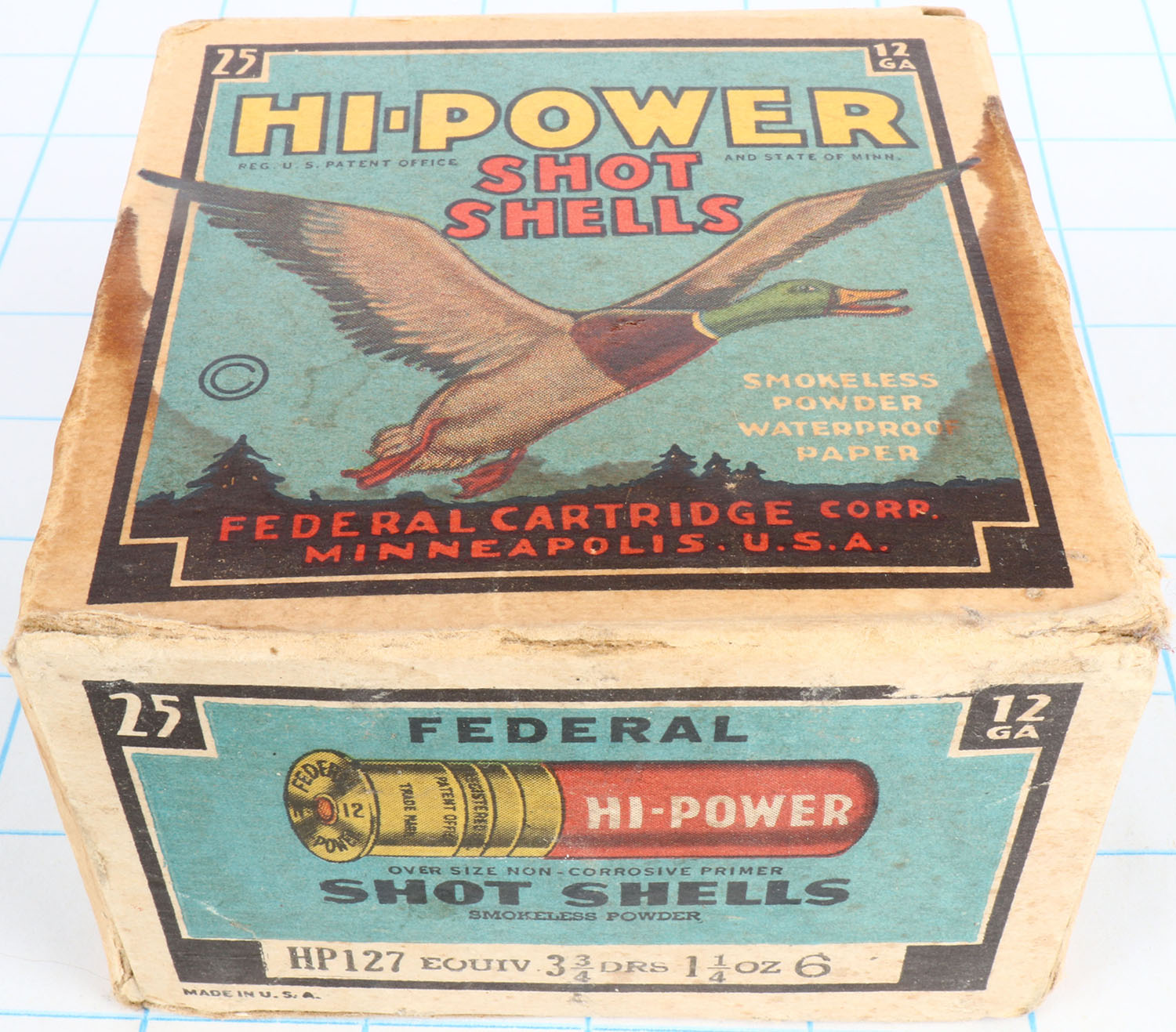 Federal Cart. Co., HI-POWER, 12ga., 1pc., Full, shot size 6, Black border, blue, yellow and red box with flying mallard, box has soiling, light edge wear & shell protrusion with very nice color, Shells are very good. Grade: Excellent - Value: 10 to 40