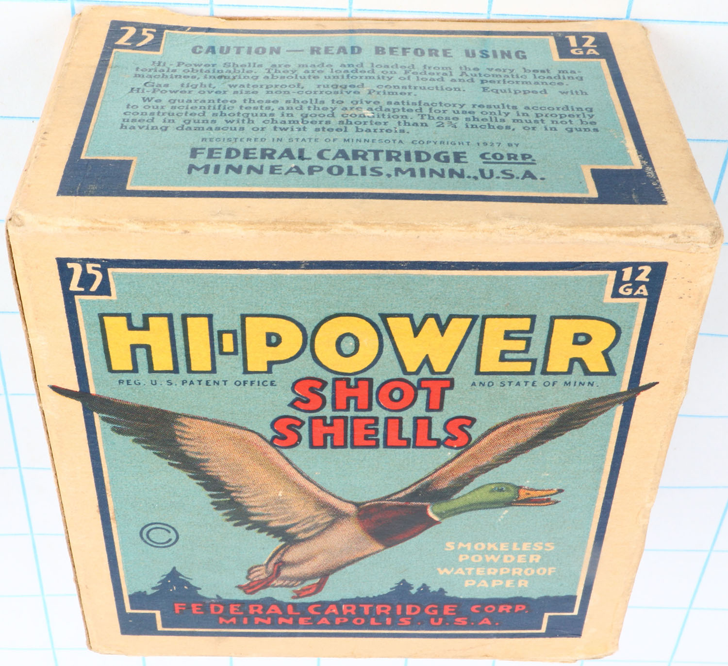 Federal Cart. Co., HI-POWER, 12ga., 1pc., Full, shot size 5, Blue border, blue, yellow and red box with flying mallard, box is very solid with small tear & great color, Shells are excellent. Grade: Excellent + - Value: 10 to 40