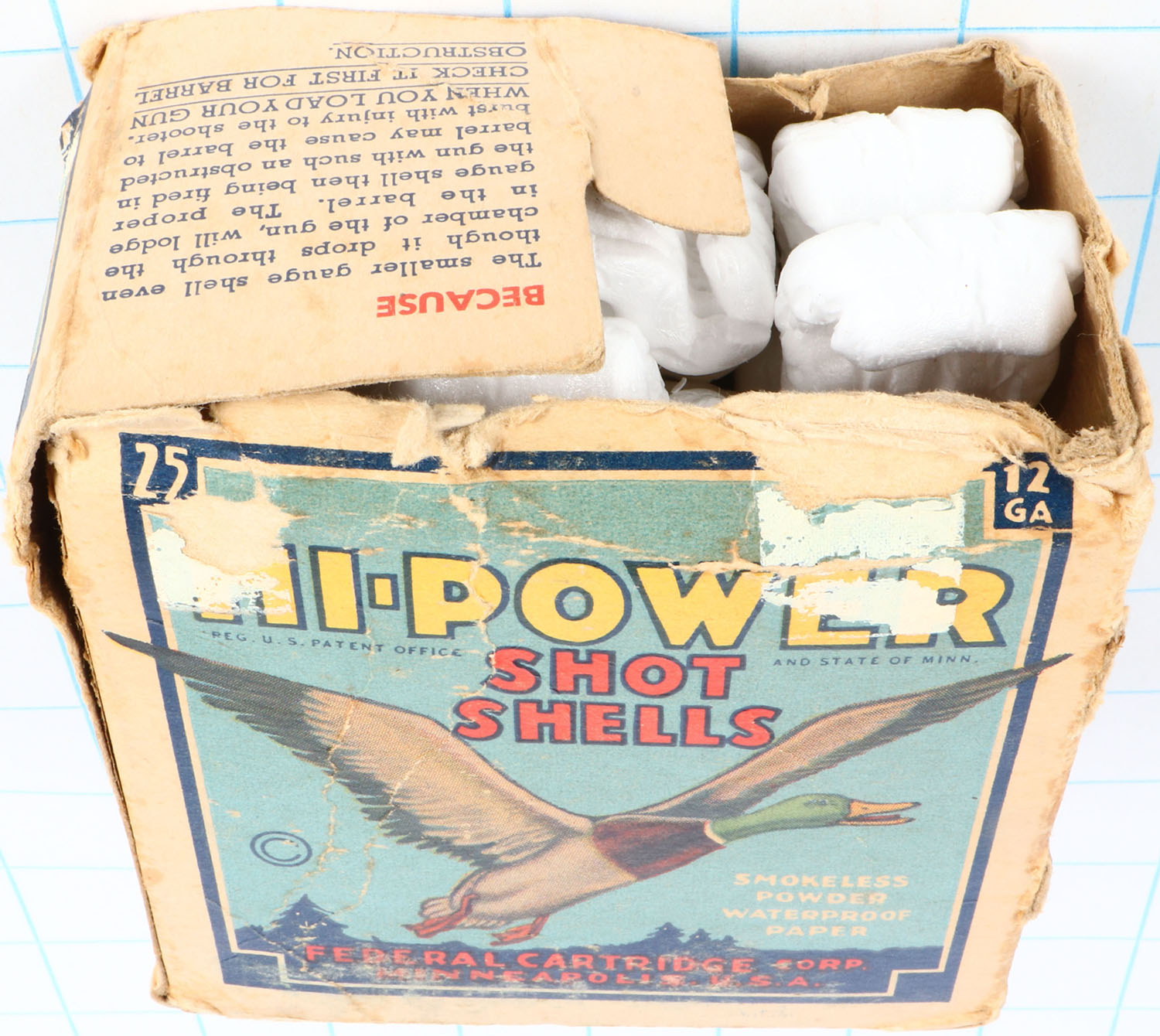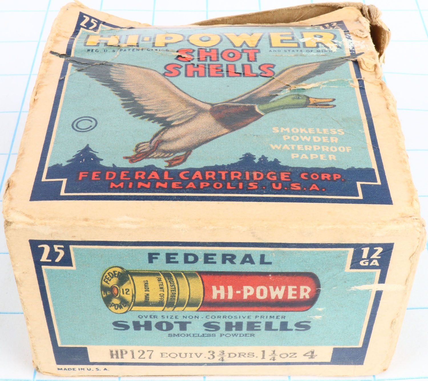 Federal Cart. Co., HI-POWER, 12ga., 1pc., Empty, shot size 4, Blue border, blue, yellow and red box with flying mallard, box has scuffing, tears, light edge wear & missing top and top inside flap with great color. Grade: Very Good + - Value: 8 to 40