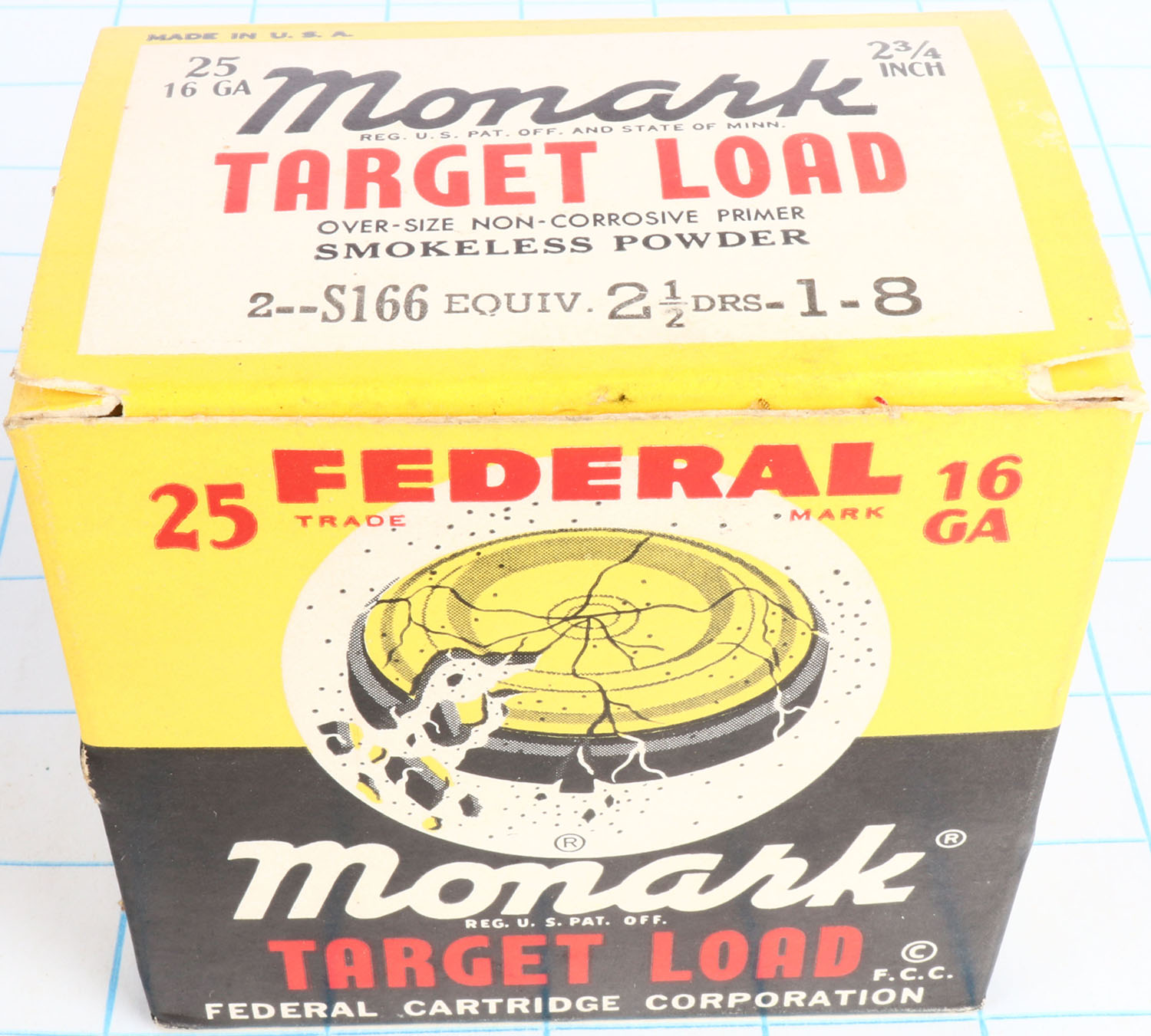 Federal, Monark, Target Load, 16ga., 1pc., Partial 21rds., shot size 8, box has small shell protrusion with great colors, shells are excellent. Grade: Excellent - Value: 10 to 50