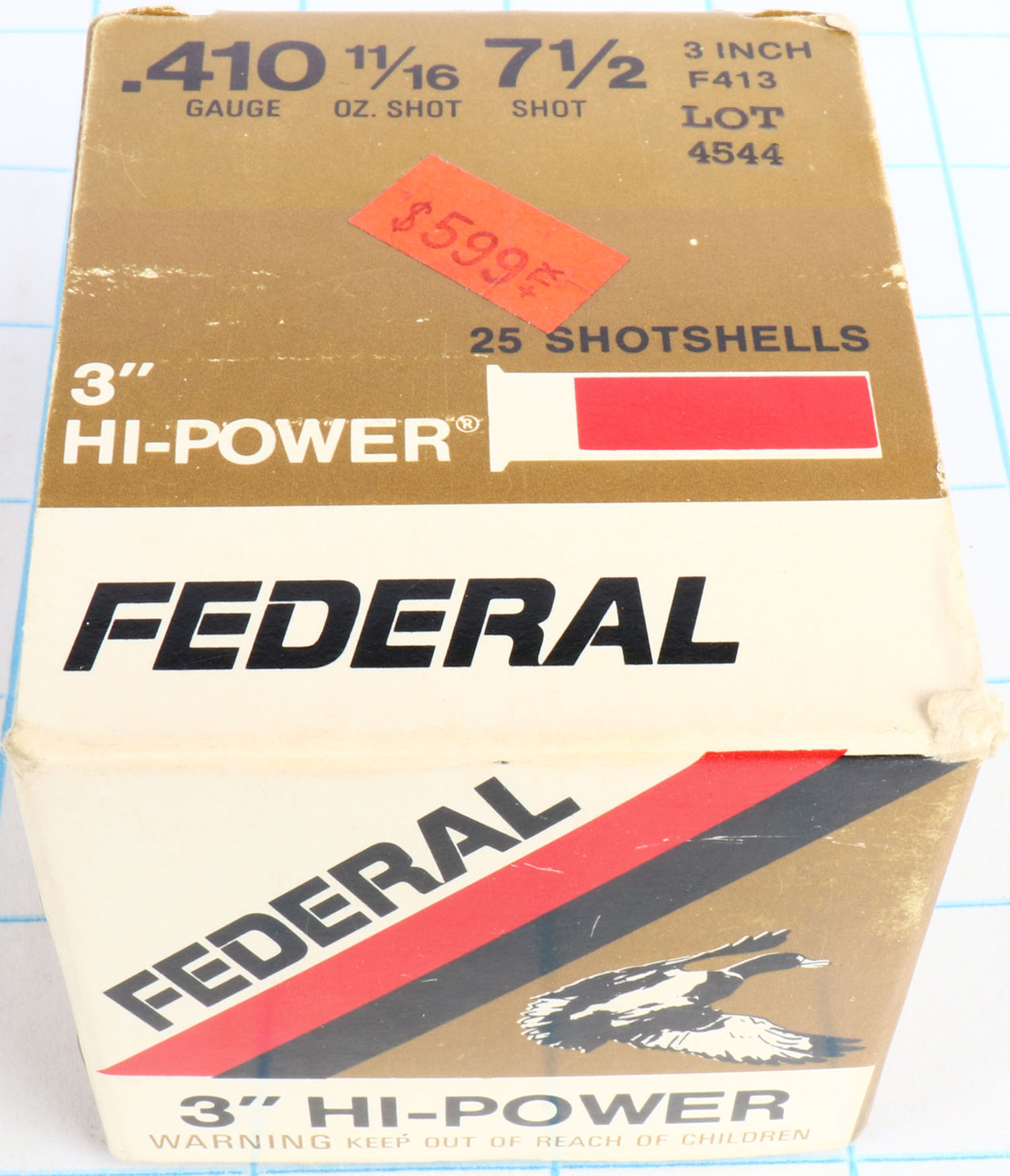 Federal, Hi-Power, 410ga., 1pc., Full, shot size 7 1/2, box is solid with great colors, shells are excellent. Grade: Excellent - Value: 10 to 30