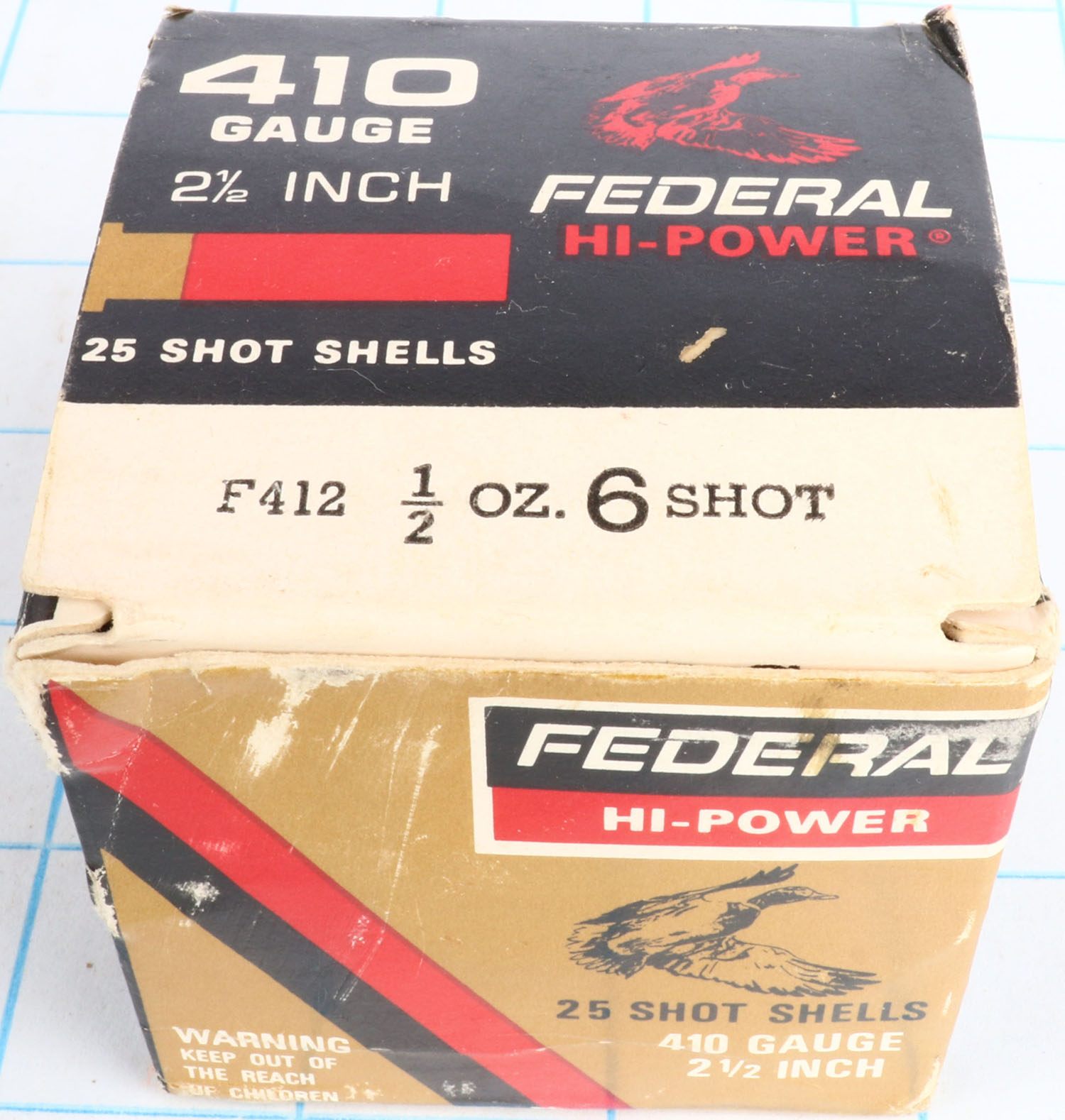 Federal, Hi-Power, 410ga., 1pc., Full with mixed primers, shot size 6, box is solid with great colors, shells are excellent. Grade: Excellent - Value: 10 to 30