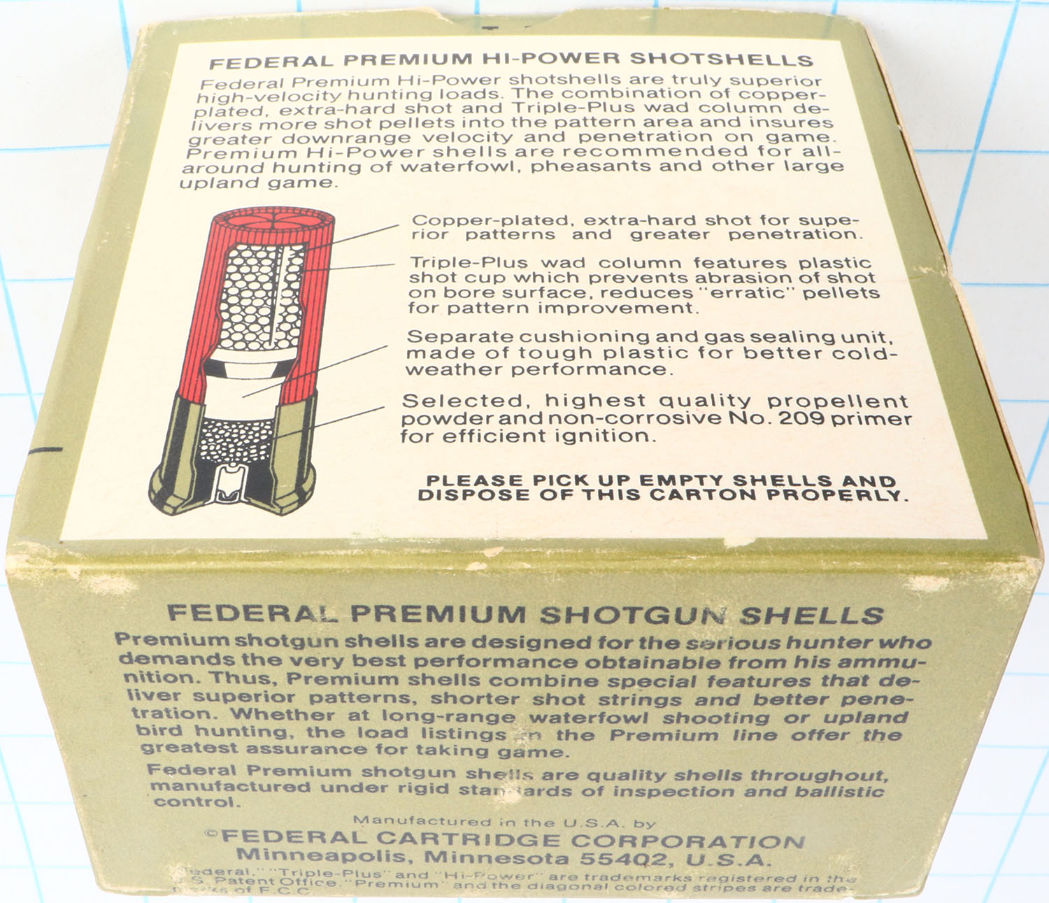 Federal, Premium Hi-Power, 12ga., 1pc., Full, shot size 4, box is solid with great colors, shells are excellent. Grade: Excellent - Value: 10 to 30