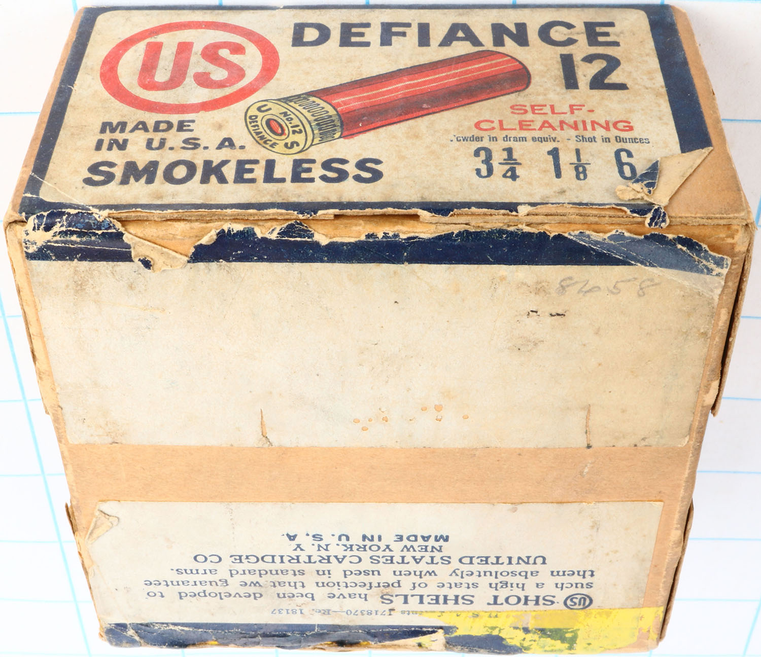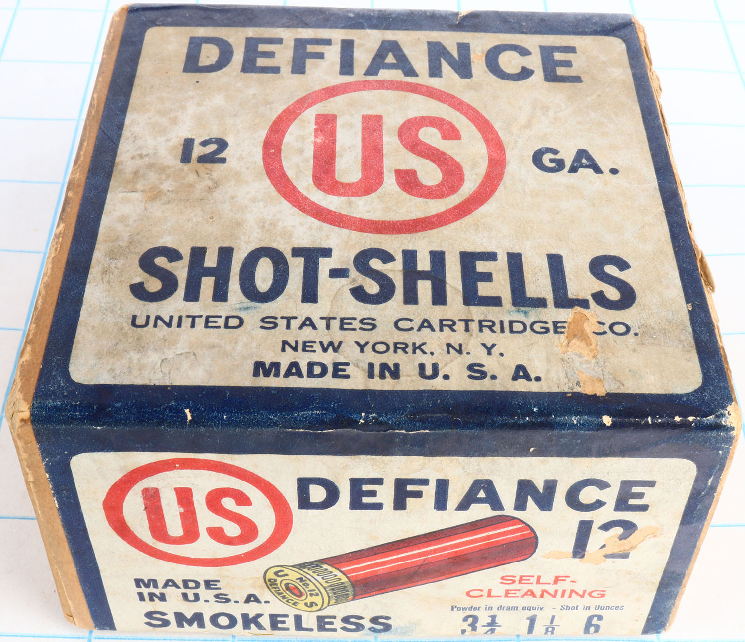 United States Cart. Co., New York, NY, DEFIANCE, 12ga., 2pc., Empty., shot size 6, buff box with white, red & blue label, box has seam split, light soiling & light scuffing with very nice label. Grade: Very Good ++ - Value: 20 to 80