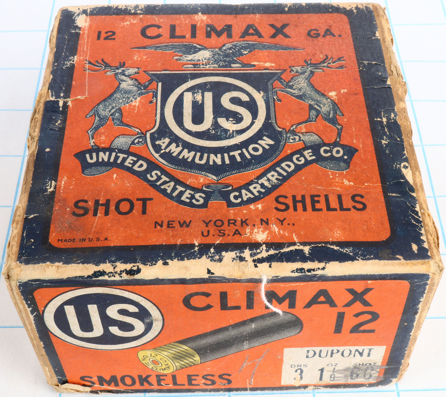 US Cart. Co., New York, NY, Climax, 12ga, 2pc., Empty, shot size 6C, buff box orange, blue & white label, box has edge wear, light soiling, light scuffing & seam splits with very nice colors. Grade: Very Good + - Value: 20 to 80