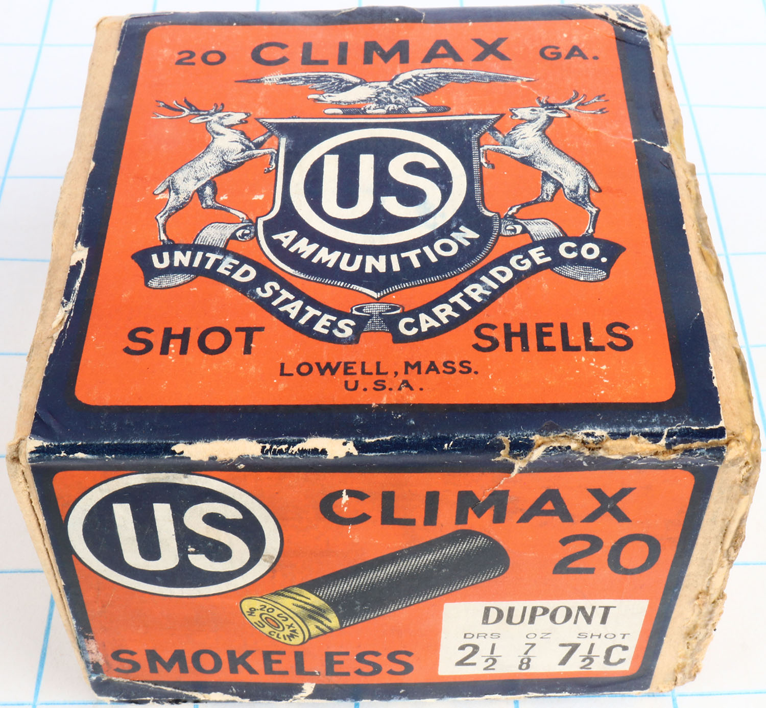 US Cart. Co., Lowell, Mass., Climax, 20ga, 2pc., Full with 1rd being incorrect shot size, shot size 7 1/2 C, buff box orange, blue & white label, box has glue repair & edge wear with great colors. Grade: Excellent - Value: 20 to 80