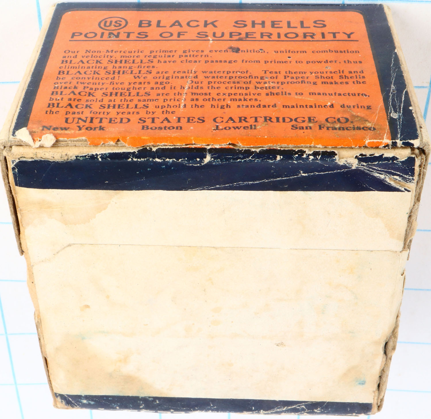 US Cart. Co., Lowell, Mass., Climax, 28ga, 2pc., Partial 15rds, shot size 7 1/2 C, buff box orange, blue & white label, box has seam splits, light edge wear & light soiling with great colors, shells are very good. Grade: Excellent - Value: 50 to 200