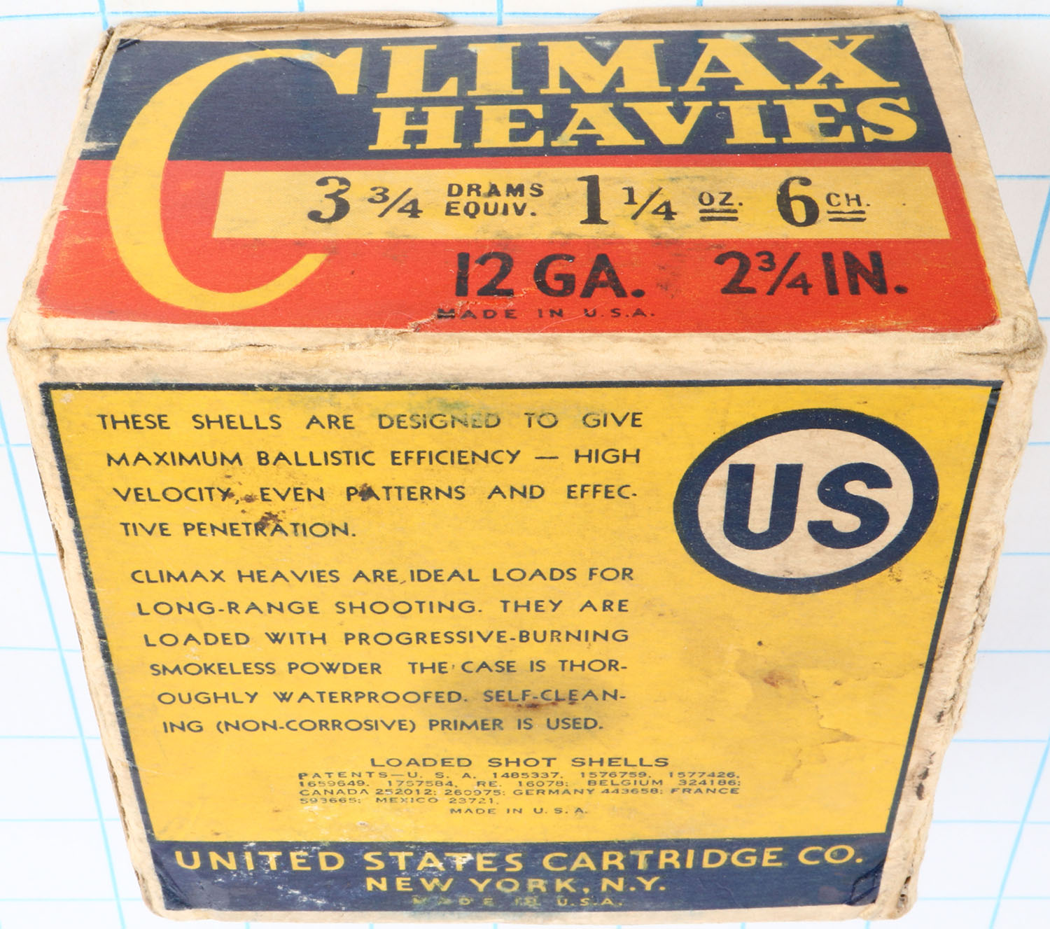 US Cart. Co., Happy Hunter Box, Climax Heavies, 2 3/4'', 12ga., 1pc., Empty, shot size 6CH, yellow, red, black & white box, box has scuffing, light soiling & torn top inside flap with very nice colors. Grade: Very Good ++ - Value: 100 to 400