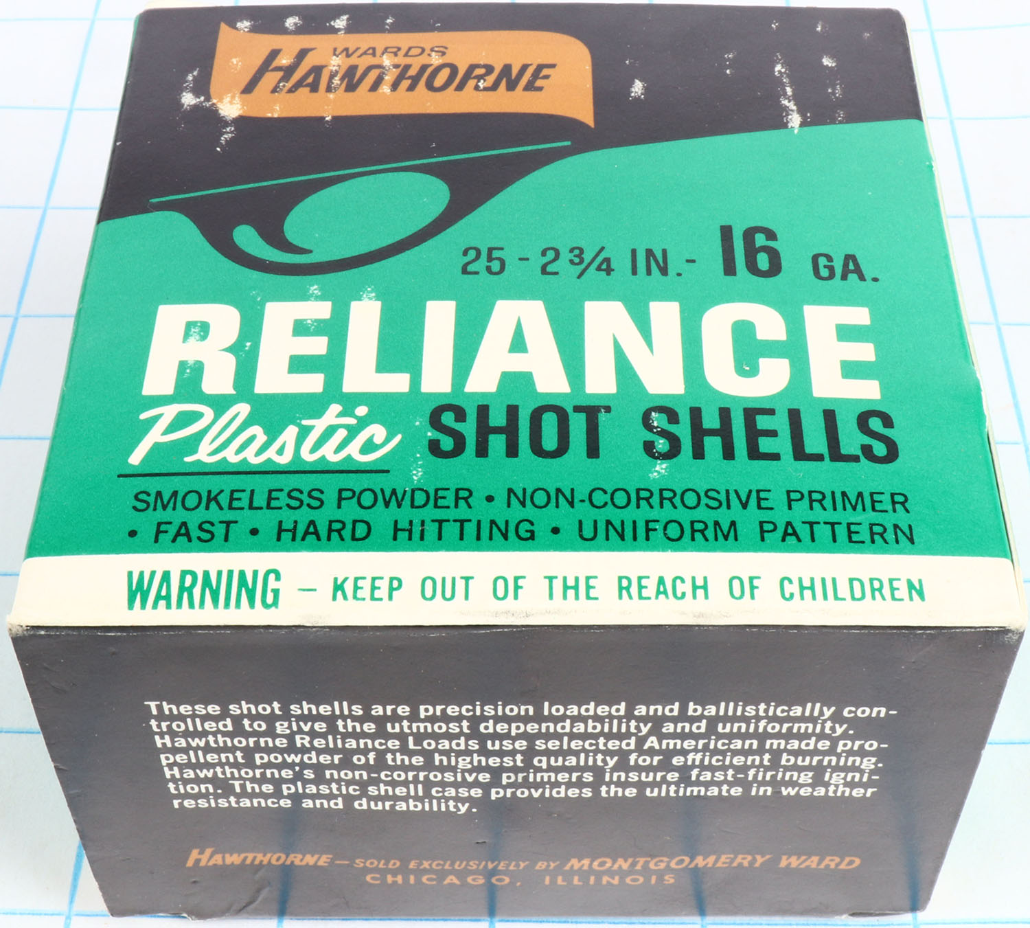 Wards Hawthorne, 16ga., 1pc., Partial 21rds., shot size 6 Field Load, box is solid with great colors, shells are excellent. Grade: Excellent + - Value: 8 to 30
