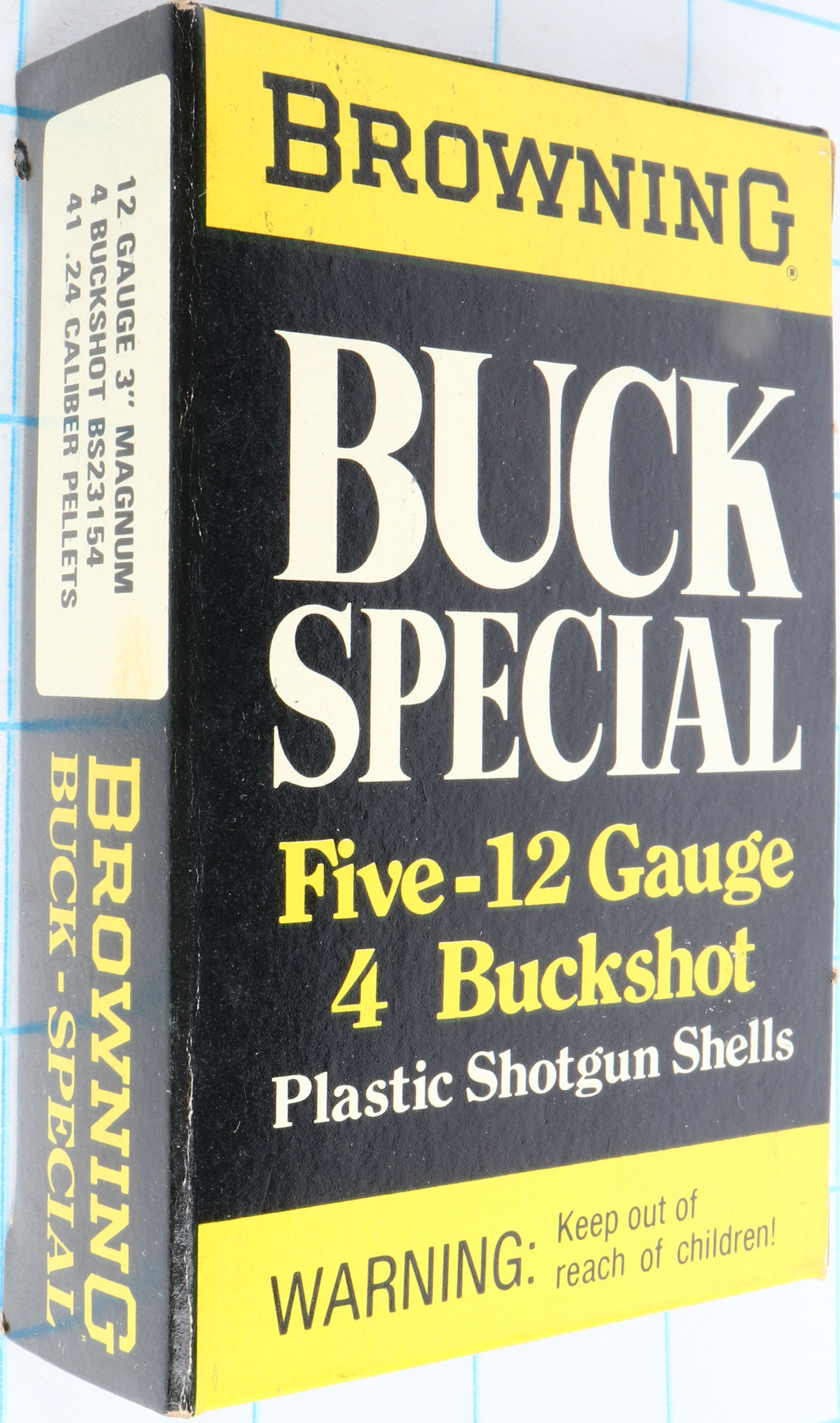 Browning, Buck Special, 12ga., 1pc., Full, shot size 4 Buckshot, 3'' Magnum, black, yellow & white box, box is solid with great color, shells are excellent. Grade: Excellent + - Value: 8 to 20