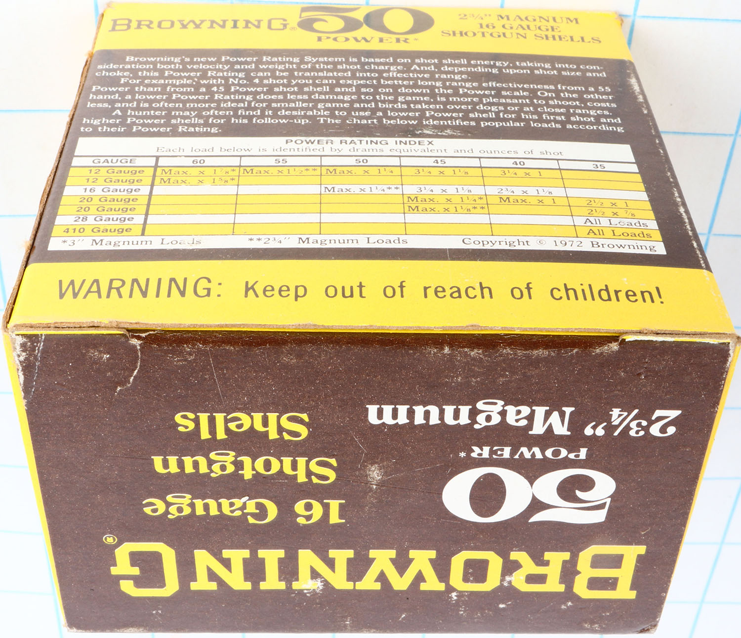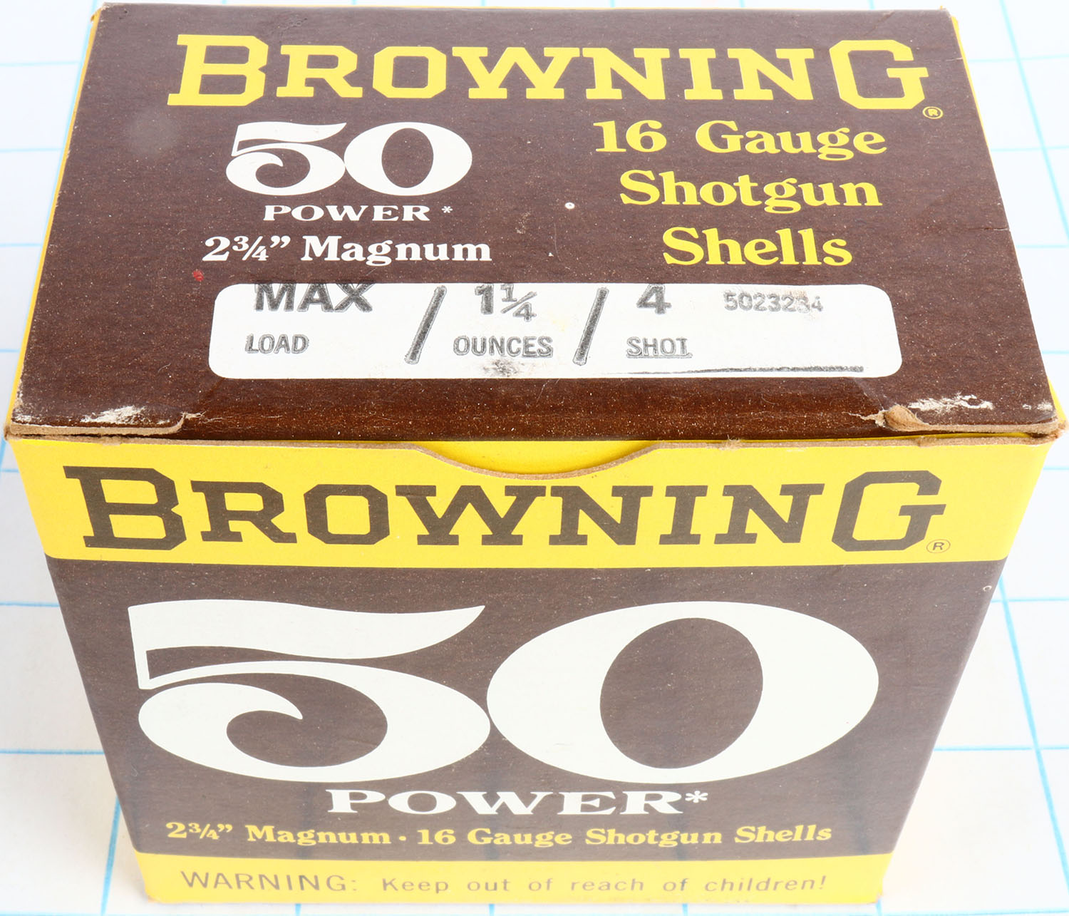 Browning, 50 Power, 16ga., 1pc., Full, shot size 4, 2 3/4'' Magnum, brown, yellow & white box, box is solid with great color, shells are excellent. Grade: Excellent + - Value: 10 to 40