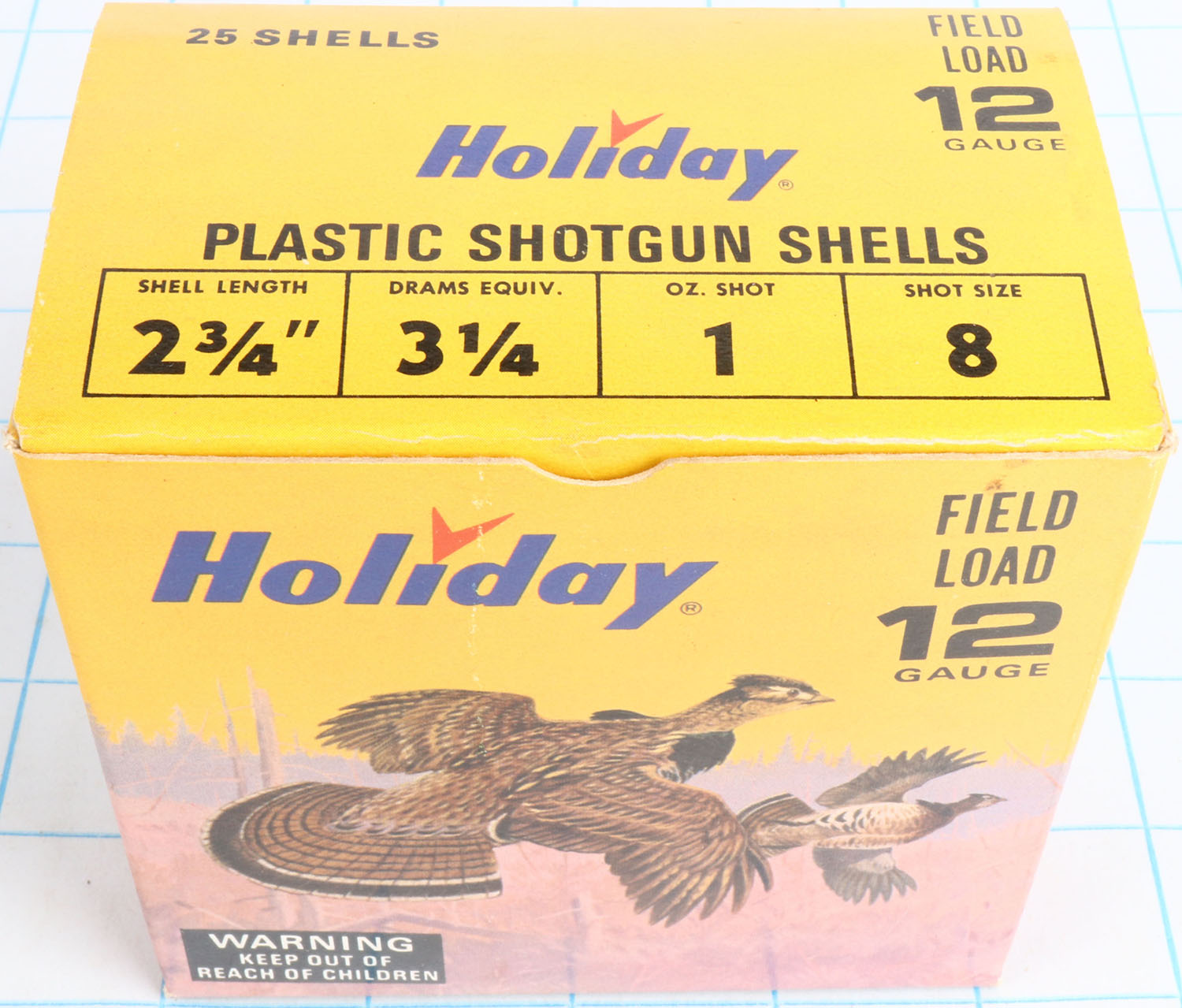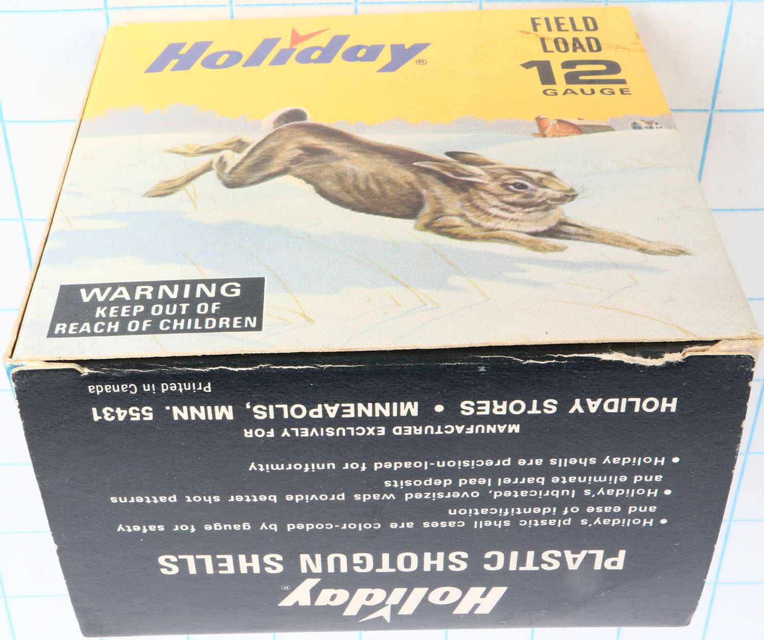 Holiday, Grouse/Rabbit Scene, 12ga., 1pc., Partial 3rds all are fired plastic, 2 3/4'', shot size 8, multi color graphics of Grouse/Rabbit by Les Kouba, box is very solid with great colors, Shells are very good. Grade: Excellent ++ - Value: 10 to 60