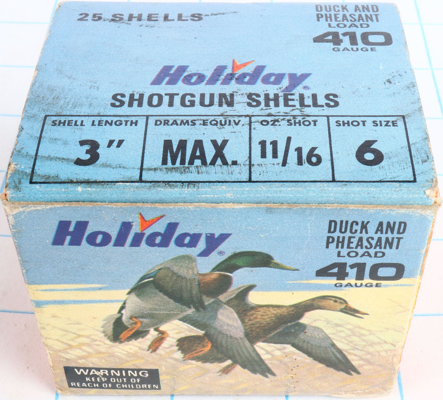 Holiday, Mallards/Pheasants, 410 GAUGE, 1pc., Partial 23rds., 3'', shot size 6, multi color graphics by Les Kouba, box is solid with great colors, light soiling & light scuffing, Shells are excellent. Grade: Excellent - Value: 40 to 180