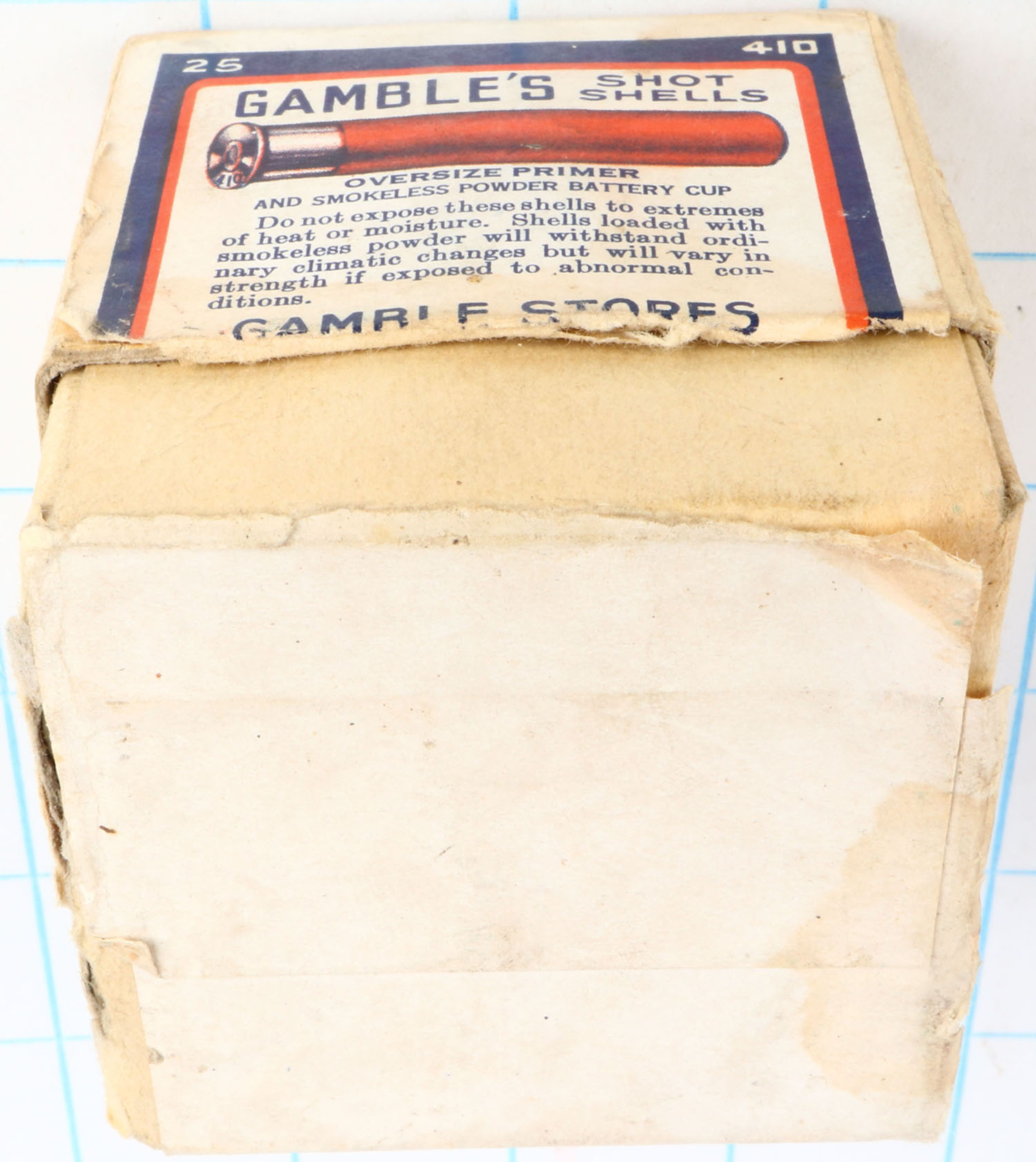 Gambles Shot Shells, ACE, 410ga., 2pc., Partial 20rds all are fired paper shells, shot size 4ch, blue, orange & white box, box has seam splits, light edge wear & light soiling with very good colors. Grade: Very Good ++ - Value: 50 to 400