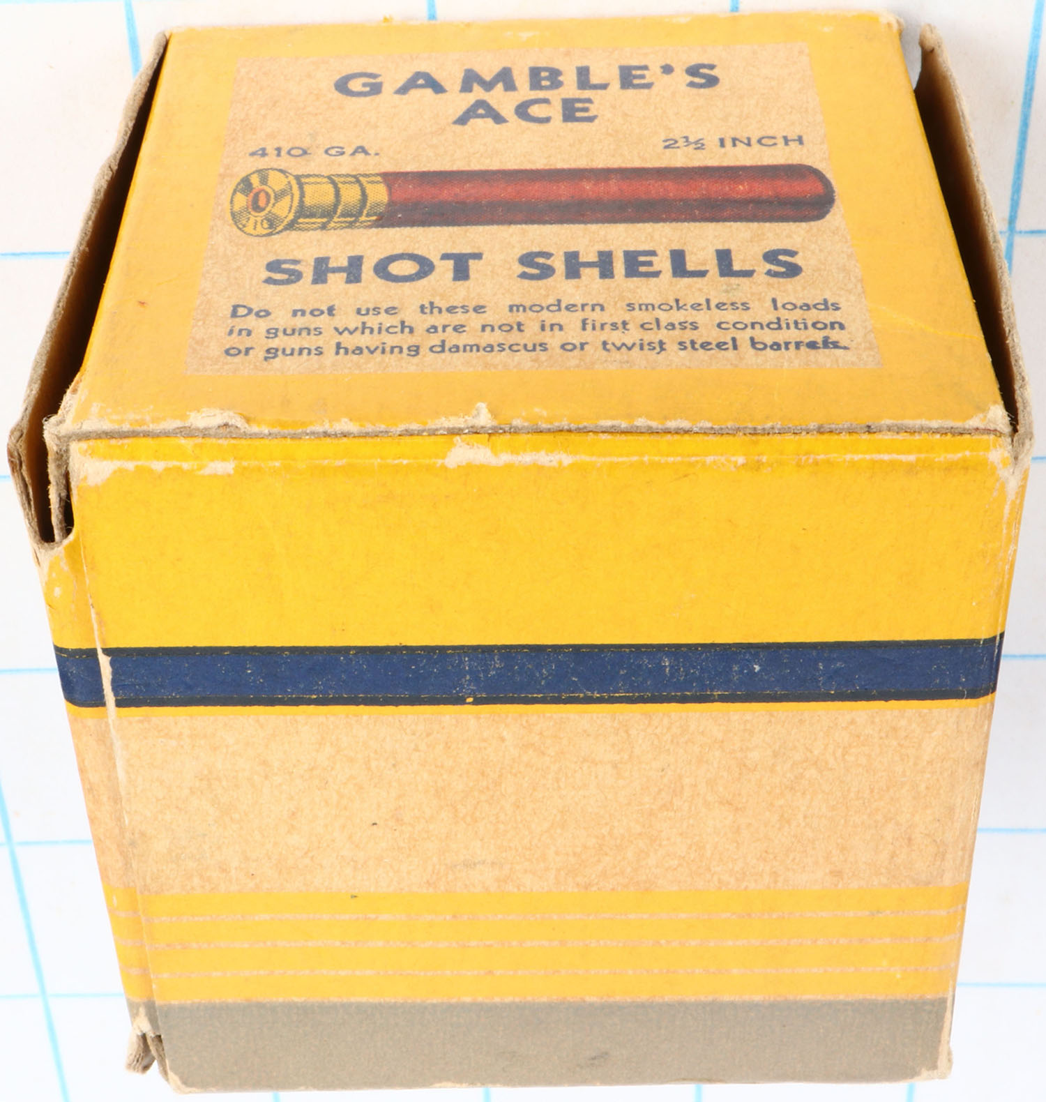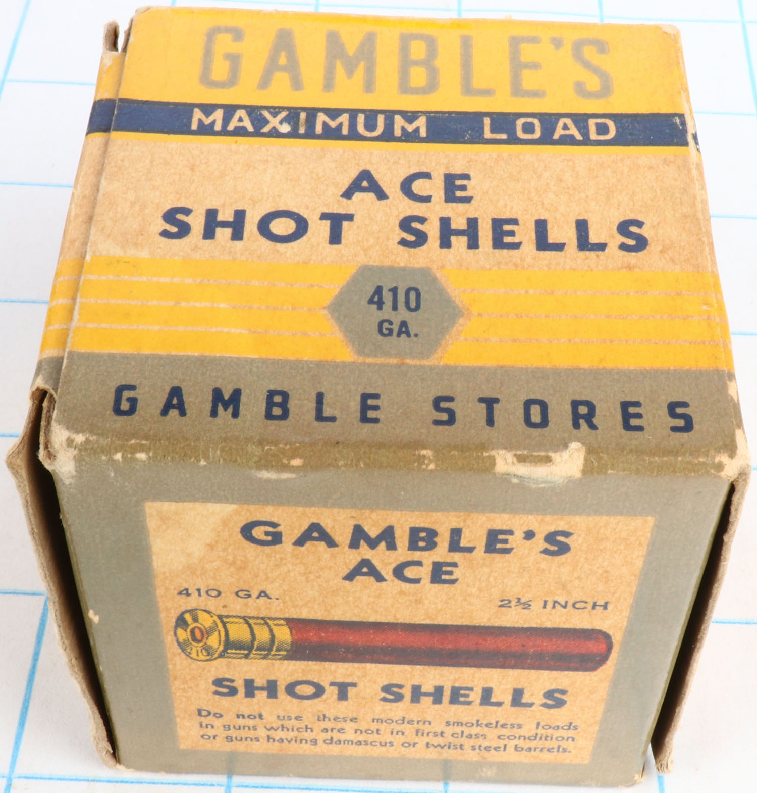 Gambles, ACE Shot Shells, .410ga., 1pc., Full, shot size 6ch, buff, blue, yellow & grey box, box is solid with light edge wear & great colors, shells are very good. Grade: Excellent - Value: 50 to 250