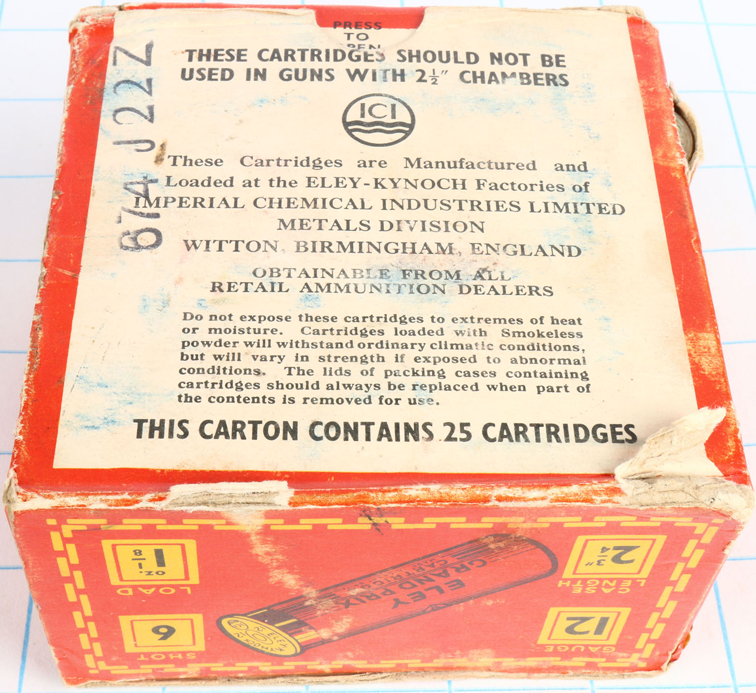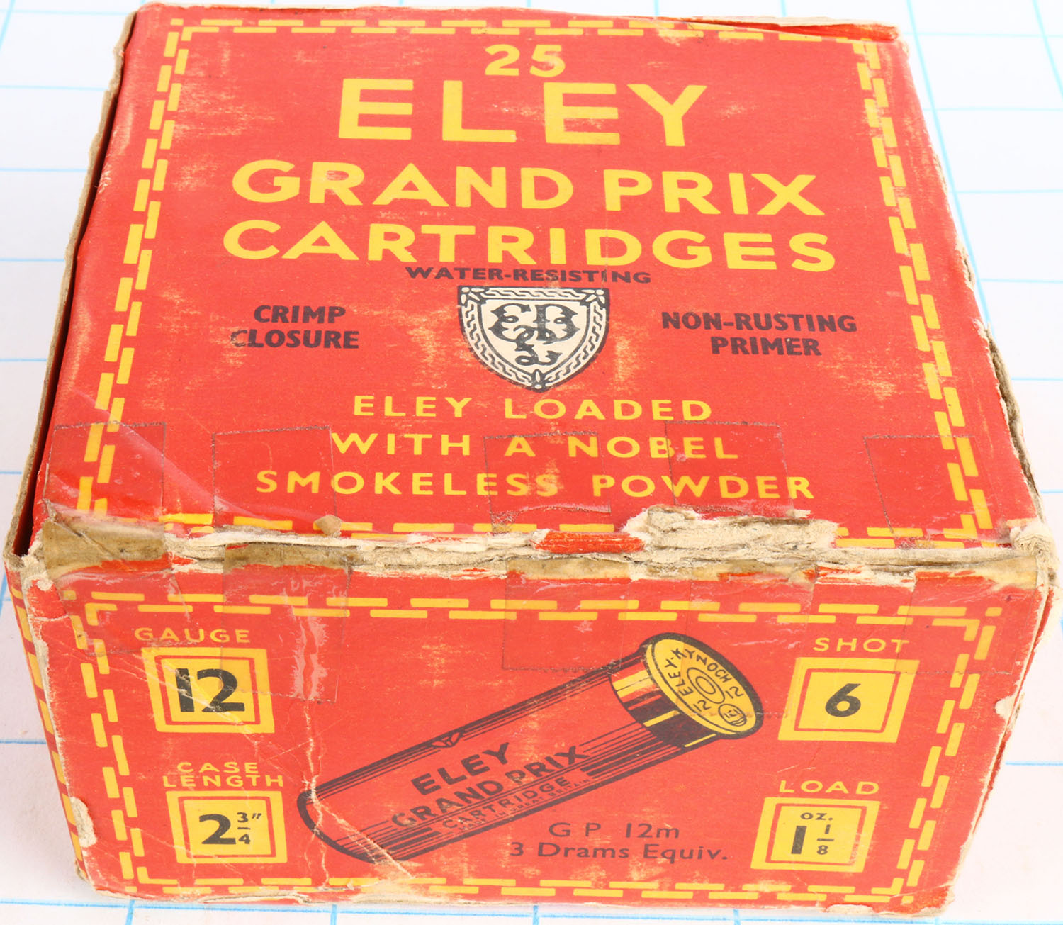 Eley, 12ga., 1pc., Full, shot size 6, multi-colored box, box has edge wear, tears & light scuffing with very nice colors, Shells are excellent. Grade: Very Good + - Value: 10 to 30