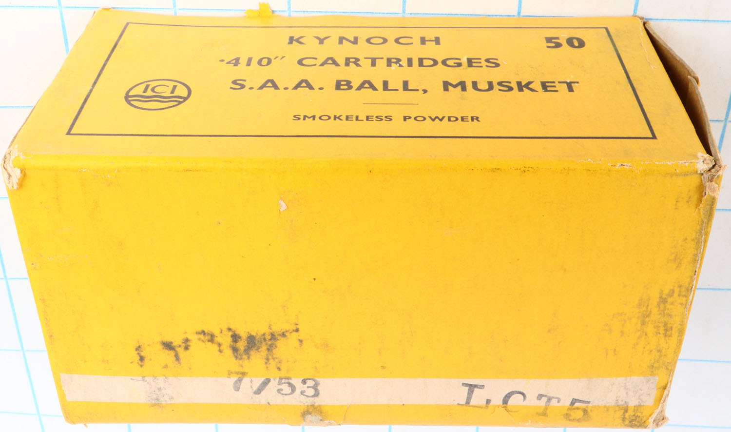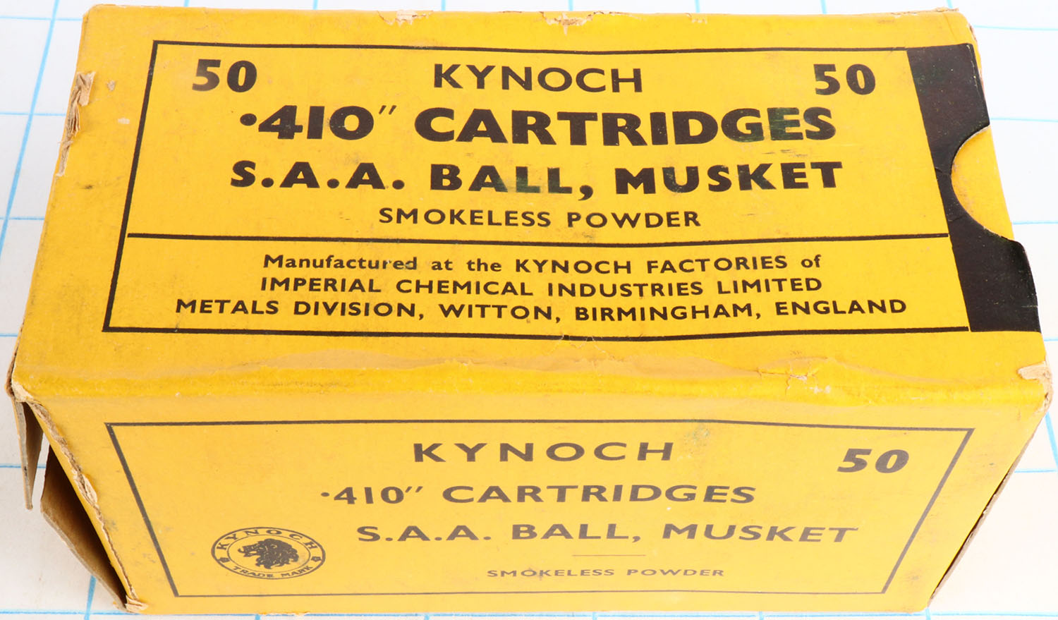 Kynoch, 410ga., 1pc., Full, shot size S.A.A. Ball Musket, multi-colored box, box seam splits, shells are excellent. Grade: Very Good ++ - Value: 10 to 30