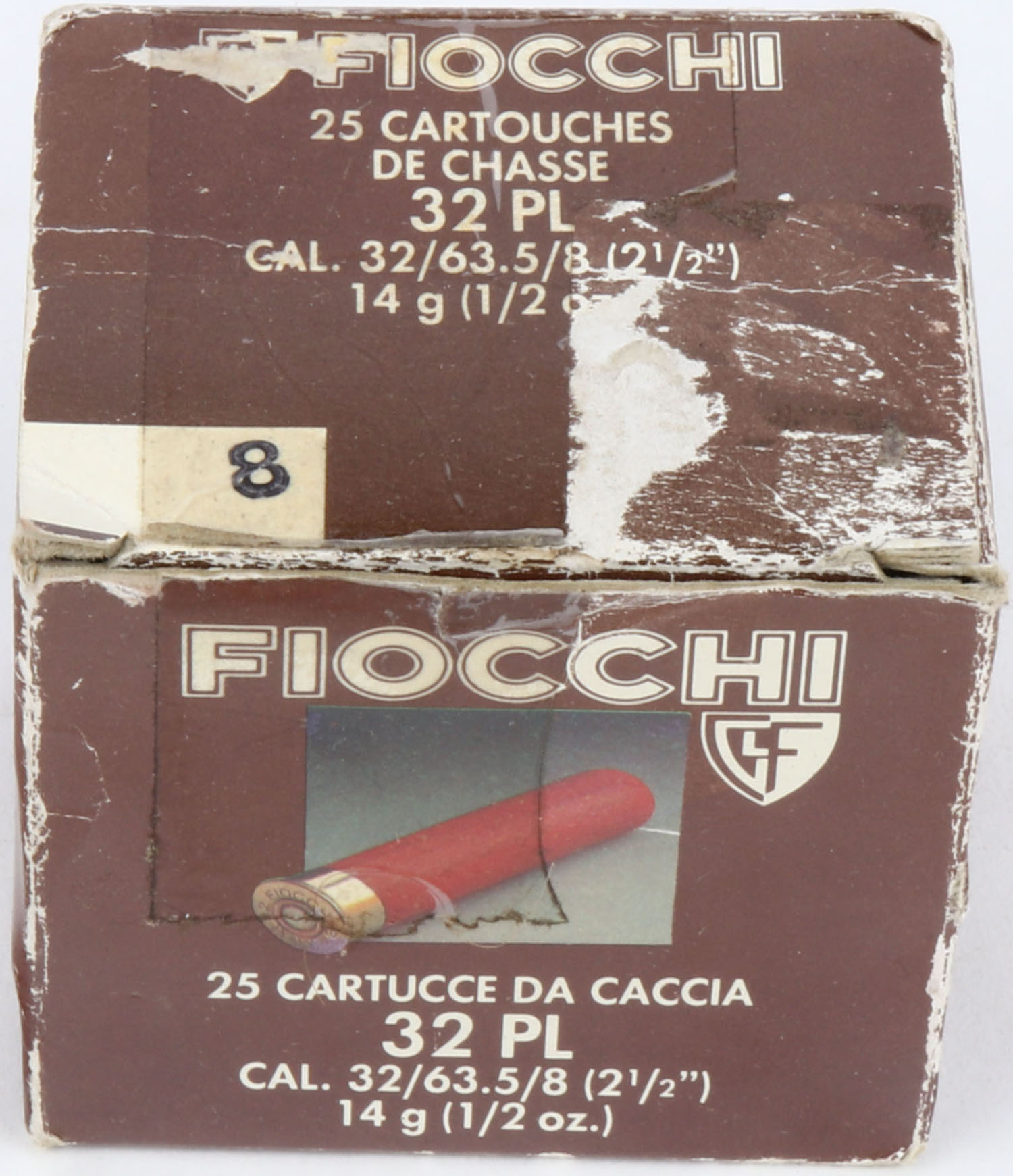 Fiocchi, 32ga., 1pc., Full, shot size 8, multi-colored box, box is solid with very nice colors, Shells are excellent. Grade: Very Good ++ - Value: 10 to 30