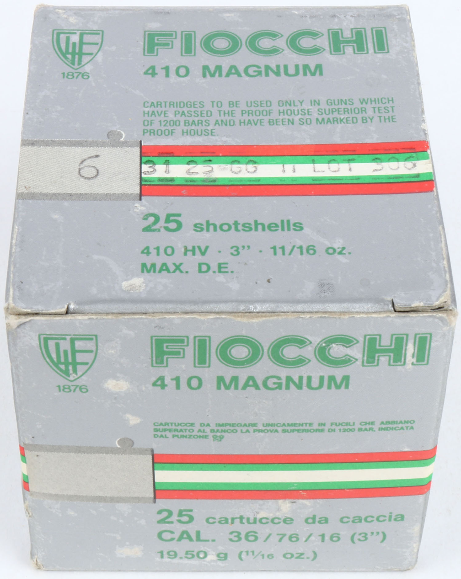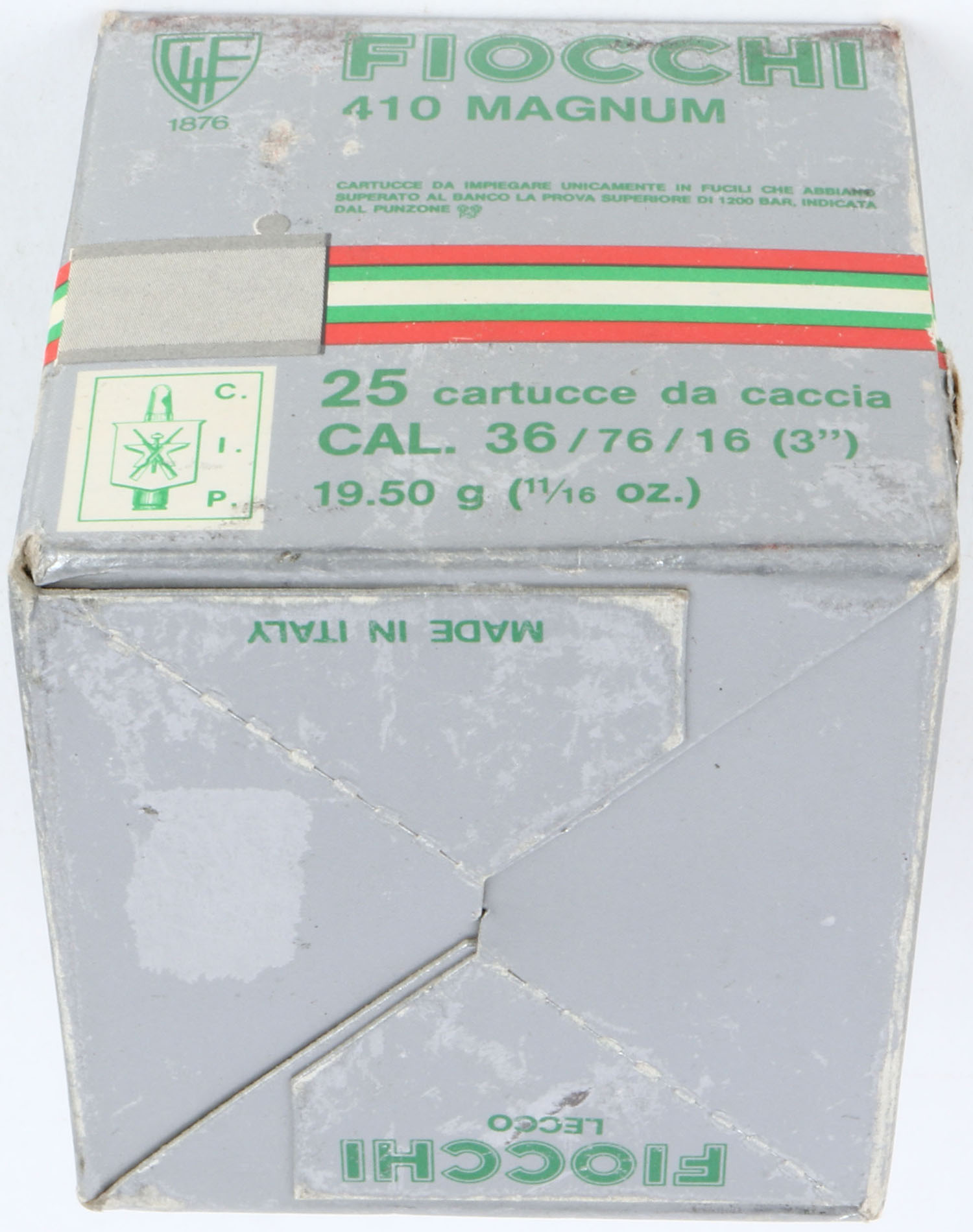 Fiocchi, 410ga., 1pc., Full, shot size 6 Magnum, multi-colored box, box is very solid with very nice colors, Shells are excellent. Grade: Very Good ++ - Value: 10 to 30