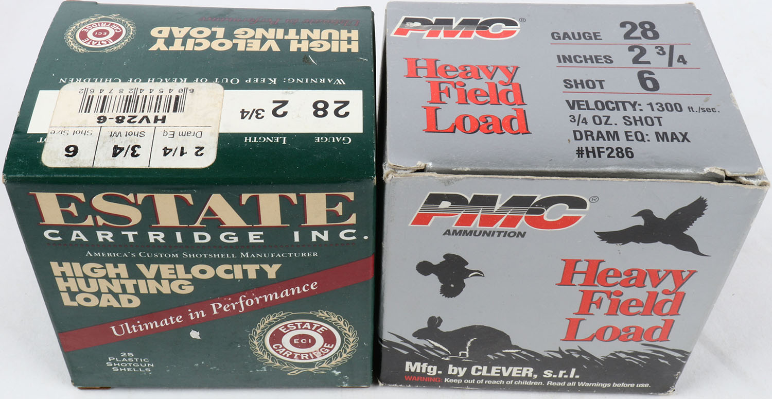 Lot of 2 PMC/Estate, 28ga, 1pc., Appears Full, shot size 6, multi-colored box. Grade: Excellent - Value: 10 to 30