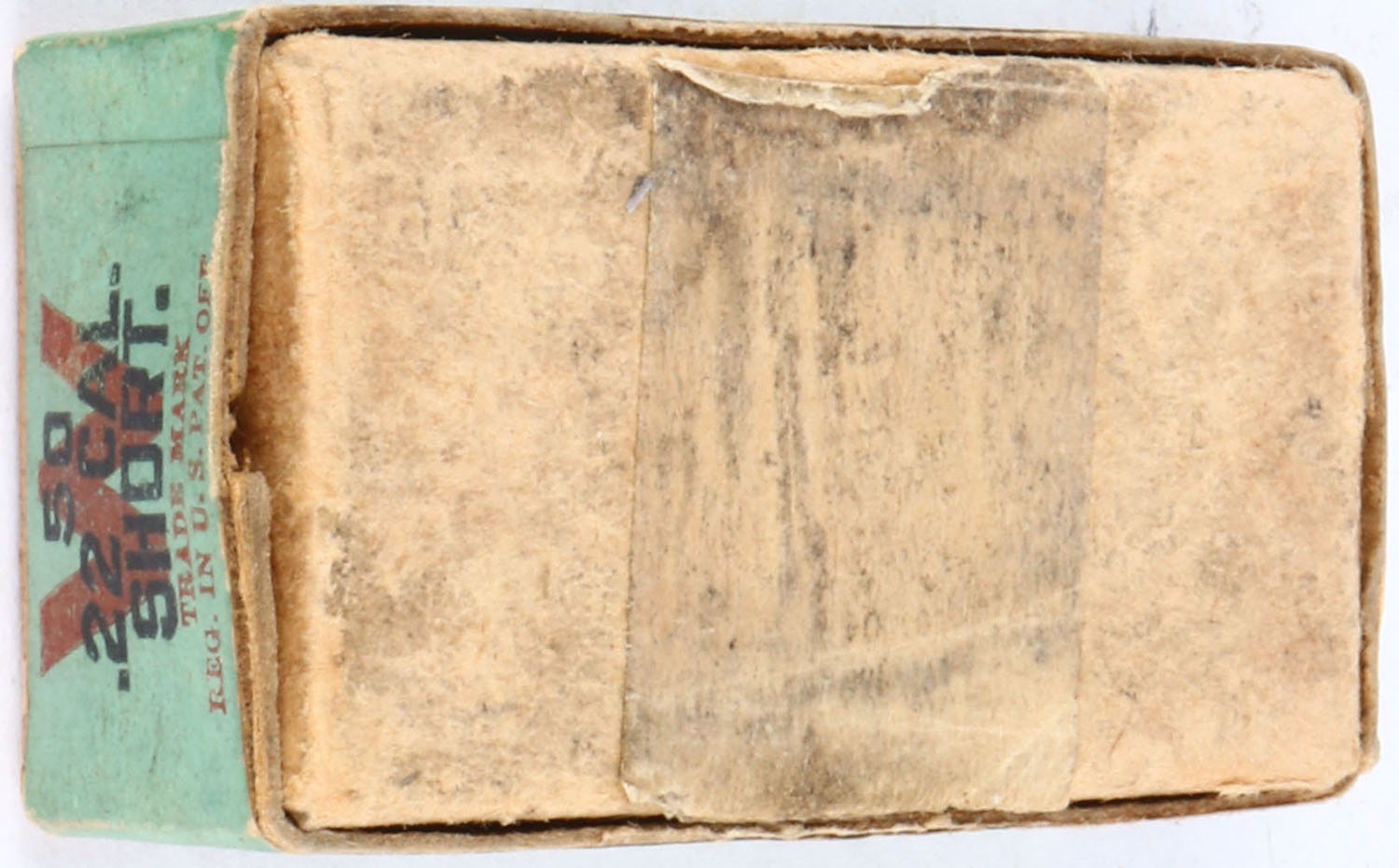 Winchester, Rifle Cartridges, .22 Short, RR: WRA-41 S-15 (only a full-cover box) Partial 49rds. Correct, 2pc. Buff box with green top & side sealing labels, box is solid with very good color, minor age soiling, some shelf wear, minor edge & corner wear, labels are intact, ammo is very good. Grade: Excellent - Value: 40 to 120