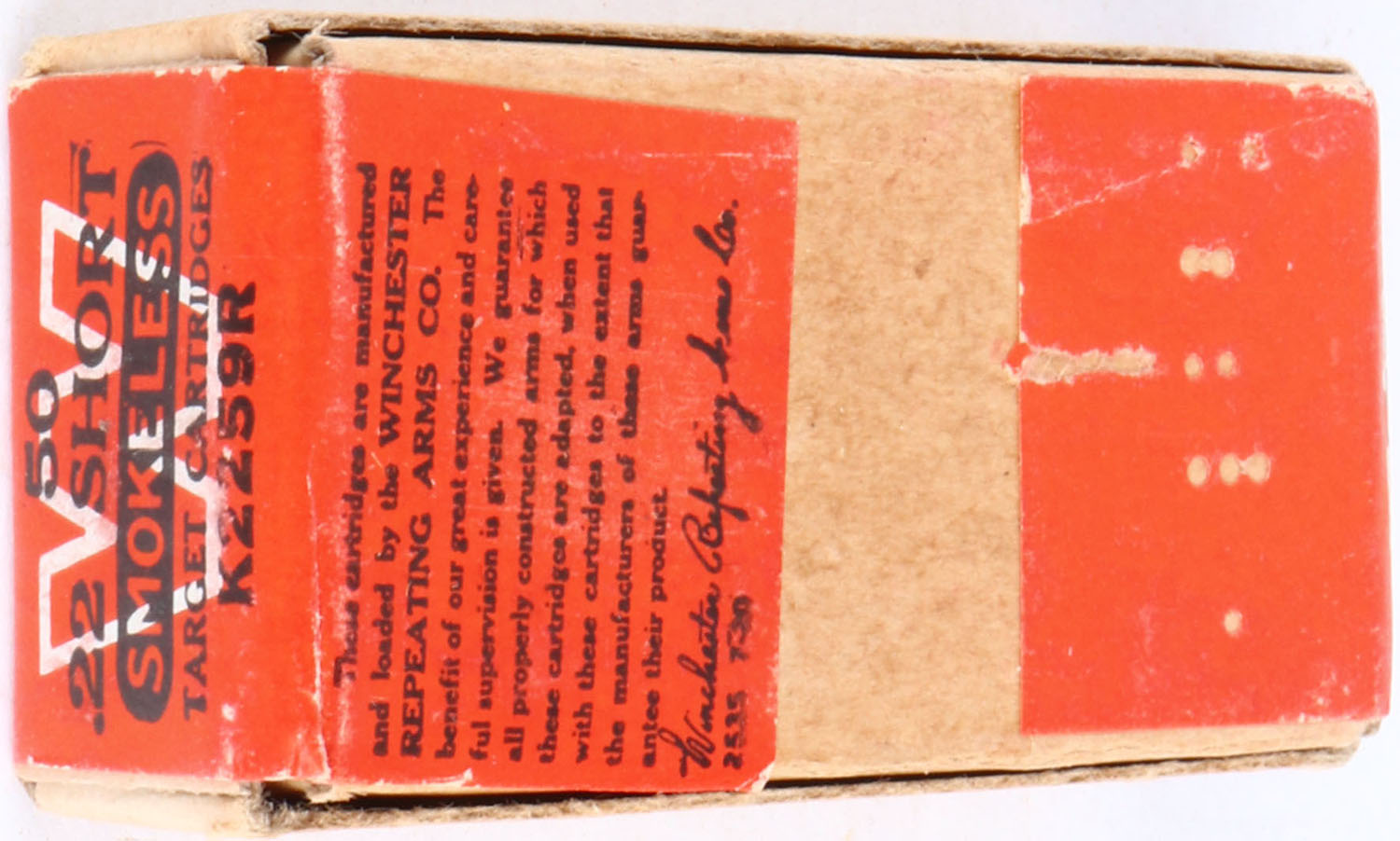 Winchester, Smokeless Rifle Cartridges, .22 Short, RR: WRA-177 S-62b, FULL & SEALED, 2pc. Buff box with red wraparound label, box is solid with excellent to minty color, only very minor shelf wear, very minor peeling to label on bottom, corners are mostly sharp, edges are crisp, label is intact. Grade: Excellent ++ - Value: 50 to 200