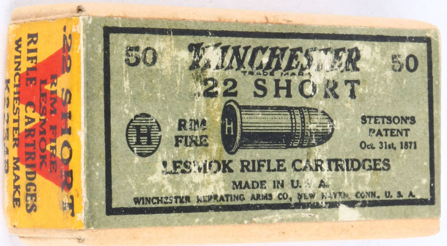 Winchester, Lesmok Rifle Cartridges, .22 Short, RR: WRA-177 S-65a, FULL & SEALED, 2pc. Buff box with green & yellow wraparound label, box is solid with very good to excellent color, some shelf wear on top, corners are mostly sharp, edges are crisp, labels are intact, sticker on bottom. Grade: Excellent - Value: 50 to 150