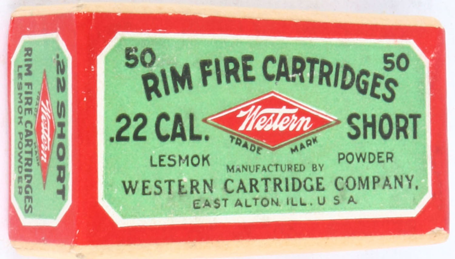 Western, Rim Fire Cartridges, .22 Short, Lesmok Powder, RHWeb: WCC-3 S-2b, FULL & SEALED, 2pc. Buff box with green & red wraparound label, box is near mint with minty color, only has very minor shelf wear on bottom, corners are mostly sharp, edges are crisp, label is intact. Grade: Excellent ++ - Value: 50 to 200