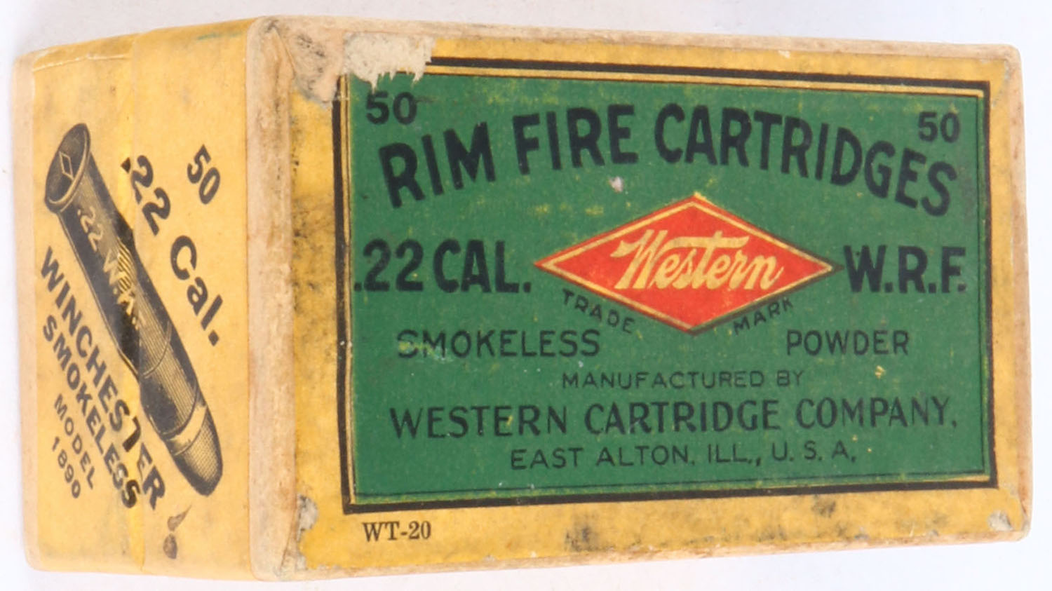 Western, Rim Fire Cartridges, .22 W.R.F., Smokeless Powder, RHWeb: WCC-3 WRF-4b, FULL & SEALED, 2pc. Buff box with green top & yellow side sealing labels, box is solid with very good to excellent color, some age soiling, minor edge & corner wear, labels are intact. Grade: Excellent - Value: 40 to 120
