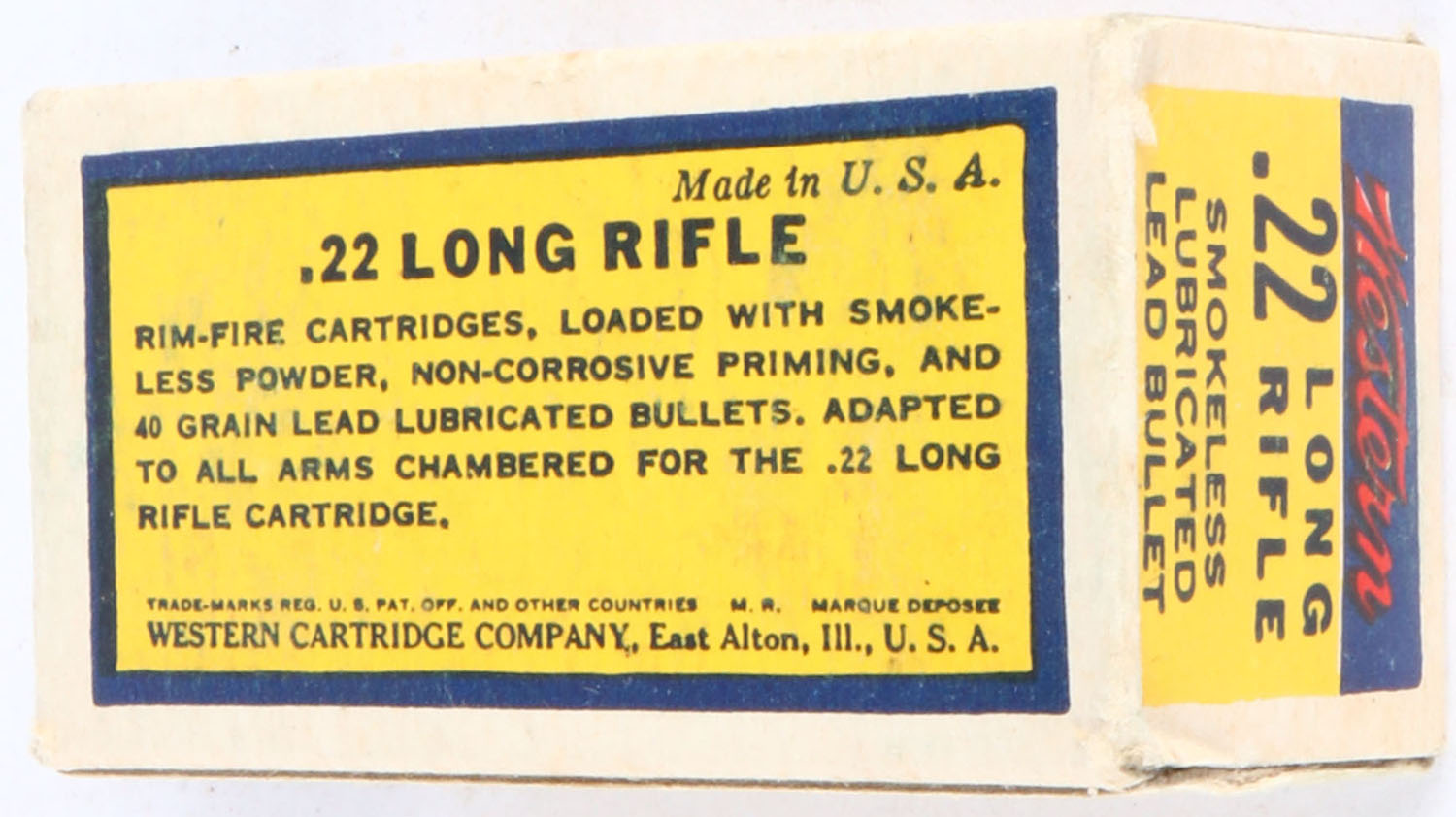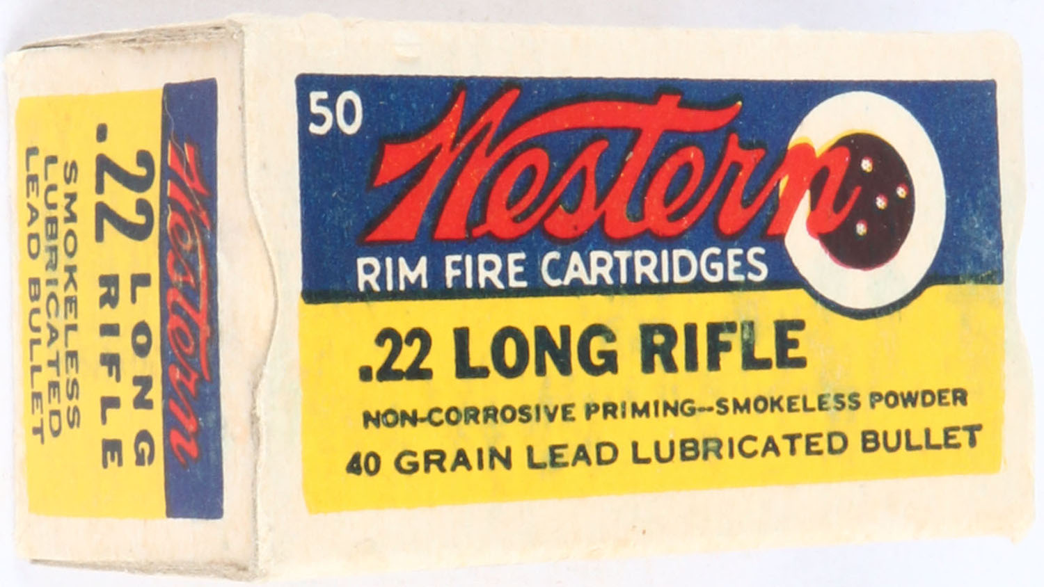 Western, Rim Fire Cartridges, .22 Long Rifle, Smokeless, RHWeb: WCC-4.3B LR-1e, Army Lot 485 - 1941, Full, 1pc. Yellow blue & red bullseye box, box is solid with excellent color, very minor age soiling, very minor edge & corner wear, end flaps are solid, ammo is excellent. Grade: Excellent + - Value: 10 to 50