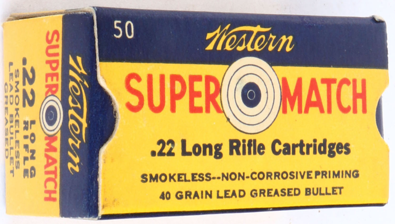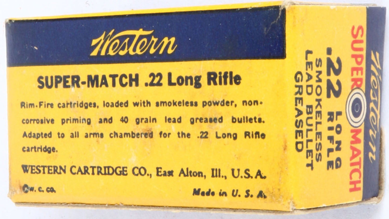 Western, Super Match, .22 Long Rifle, RHWeb: WCC-51.1 LR-4d, Full, 1pc. Yellow blue & red box, box is solid with excellent to minty color, very minor corner wear, very minor staining on bottom, edges are crisp, end flaps are solid, ammo is excellent. Grade: Excellent ++ - Value: 20 to 60