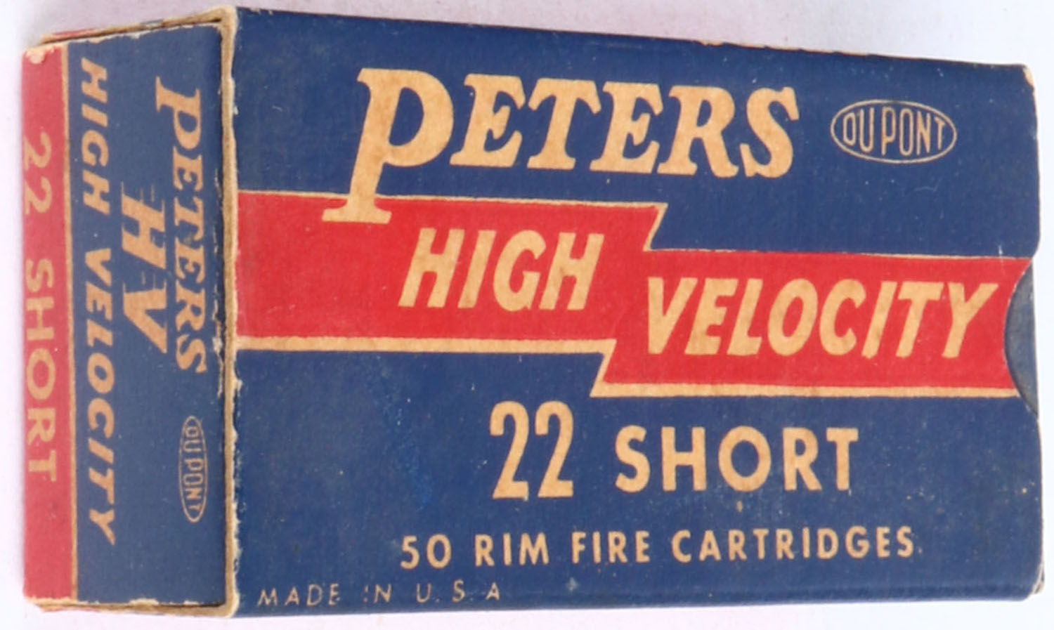 Peters, High Velocity, .22 Short, RHWeb: PCC-17 S-1a, Full, 1pc. Blue red & white box, box is solid with very good color, some age soiling, minor edge & corner wear, end flaps are solid, ammo is excellent. Grade: Excellent - Value: 8 to 40