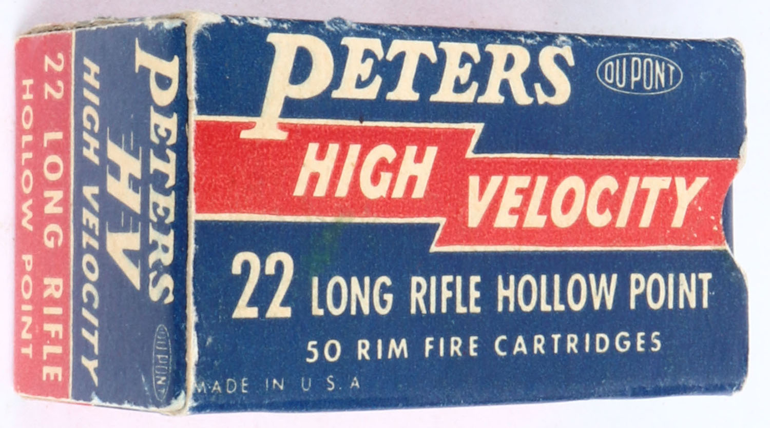 Peters, High Velocity, .22 Long Rifle Hollow Point, RHWeb: PCC-17 LR-3c, Full, 1pc. Blue red & white box, box is solid with excellent color, very minor edge & corner wear, end flaps are solid, ammo is excellent. Grade: Excellent - Value: 8 to 40