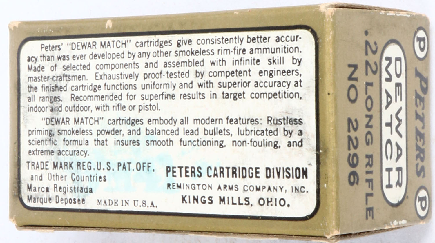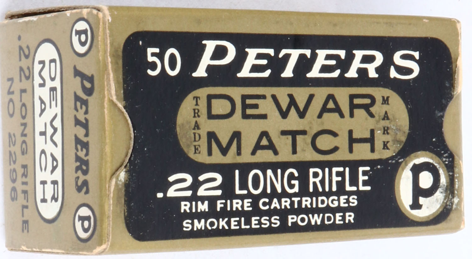 Peters, Dewar Match, .22 Long Rifle, RHWeb: PCC-53B LR-2c (only with copper cases), Full, 1pc. Black gold & white box, box is solid with excellent color, some shelf wear, very minor edge & corner wear, end flaps are solid, ammo is excellent. Grade: Very Good ++ - Value: 20 to 60