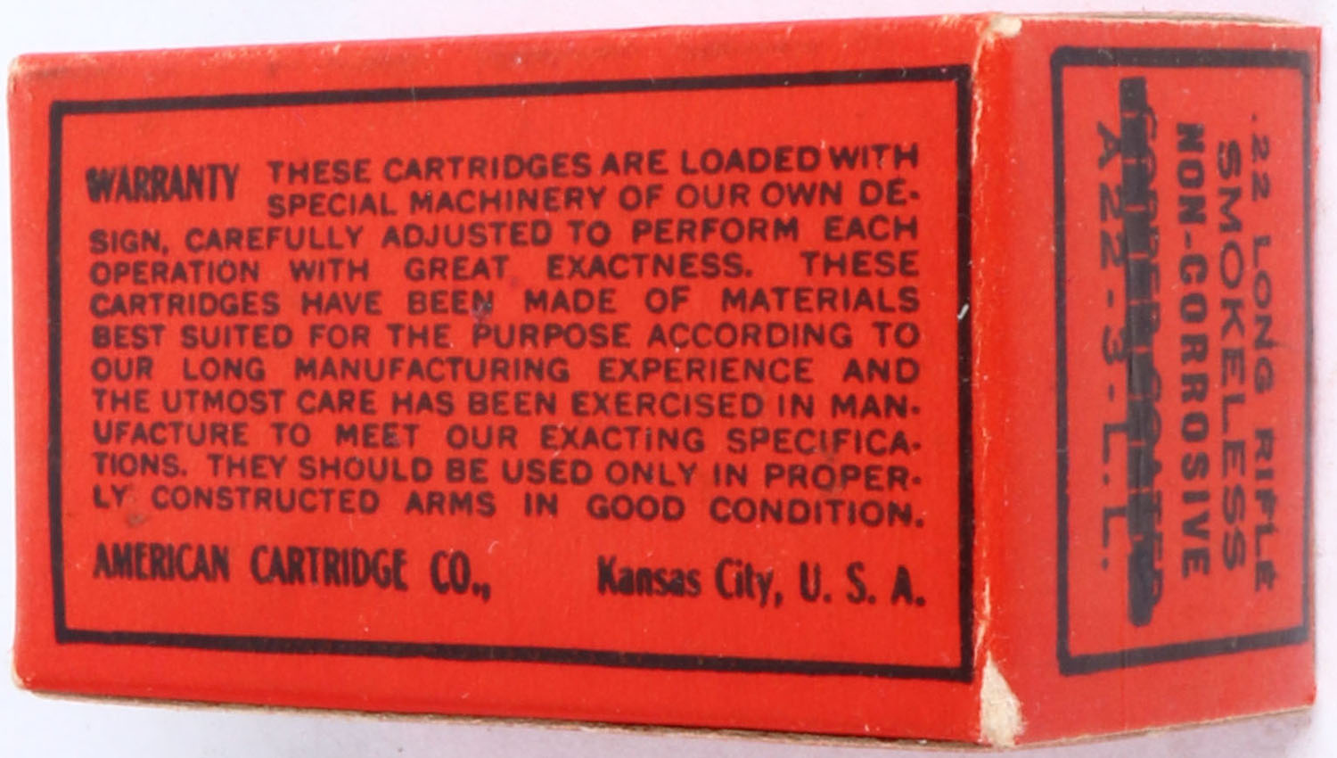 American, American Eagle, .22 Long Rifle, A22-3 - L.L., RHWeb: ACC-1 LR-3.1 (no h/s on a brass case), Full, 1pc. Red black & white box, box is solid with excellent color, some staining to top, very minor corner wear, edges are crisp, end flaps are solid, ammo is excellent. Grade: Excellent + - Value: 30 to 120