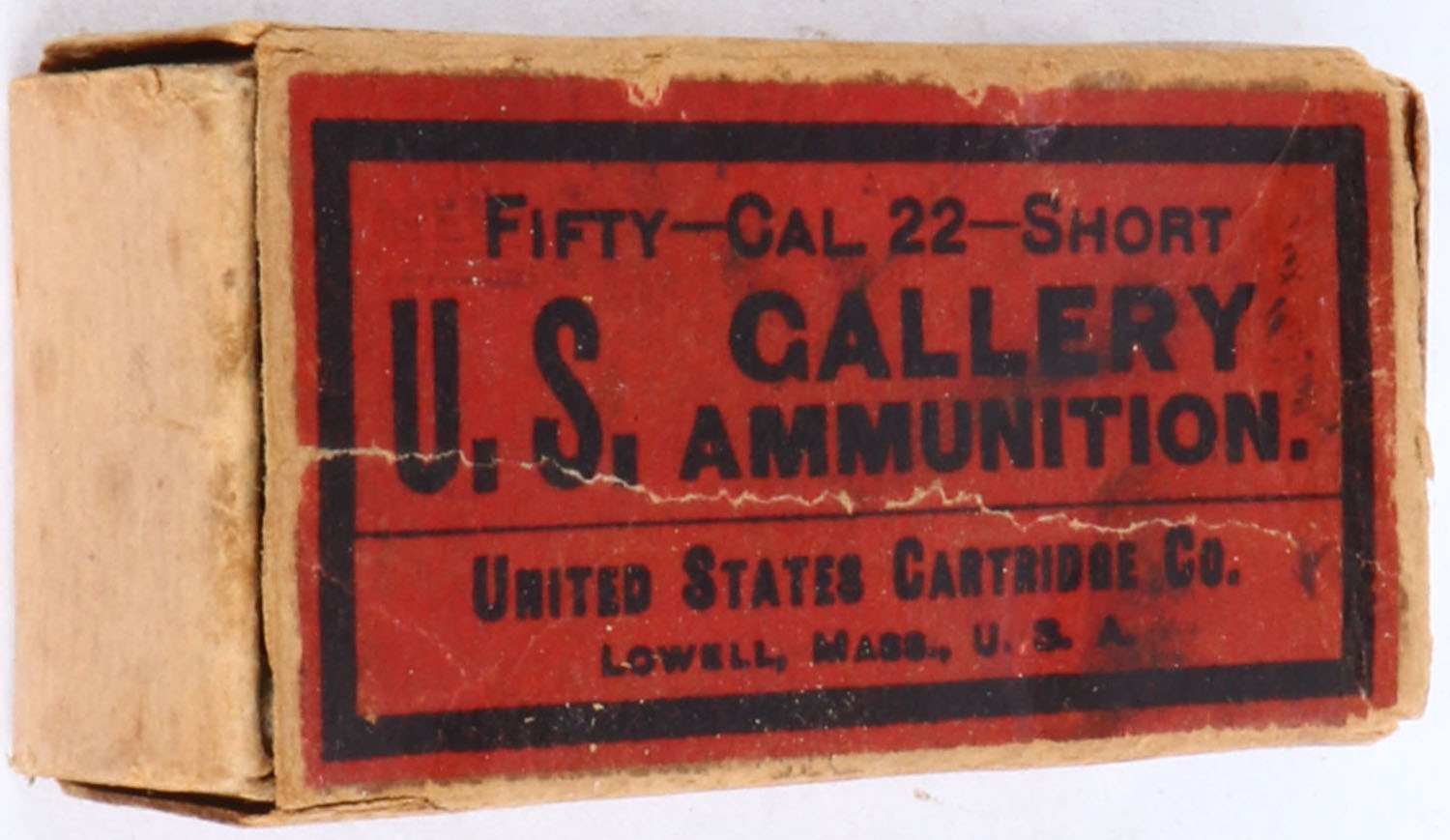 U.S., Gallery Ammunition, .22 Short, Target Cartridges, RHWeb: US-50A S-1b, Full, 1pc. Red orange & black box, box has very good color, age soiling, edge & corner wear, crease across the top, ammo is very good. Grade: Good + - Value: 6 to 60
