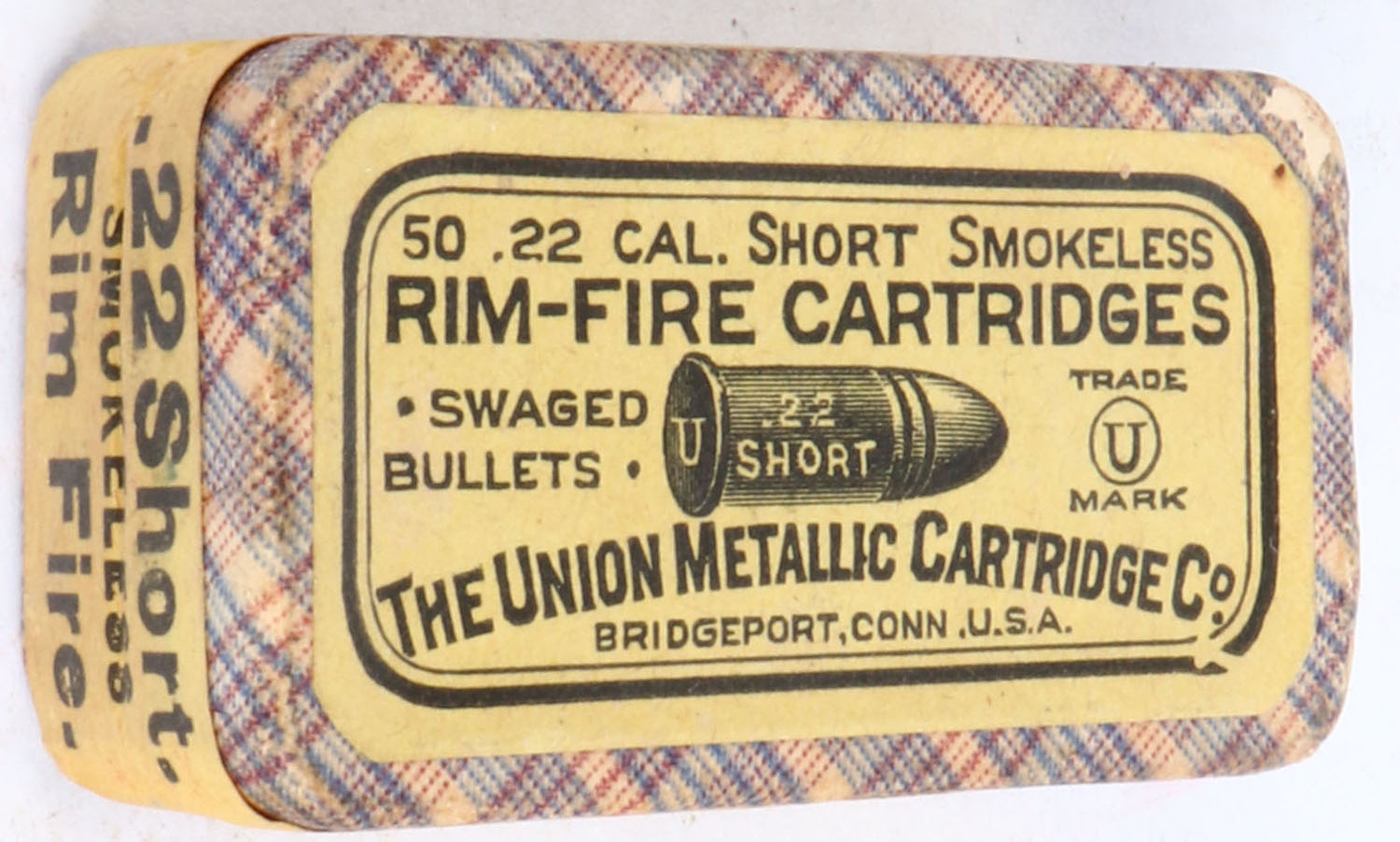 UMC, Rim-Fire Cartridges, .22 Short, Smokeless, RHWeb: UMC-8 S-8b, FULL & SEALED, 2pc. Purple fabric box with yellow top & side sealing labels, box is solid with excellent color, only very minor age soiling & edge wear, labels are intact. Grade: Excellent ++ - Value: 40 to 120