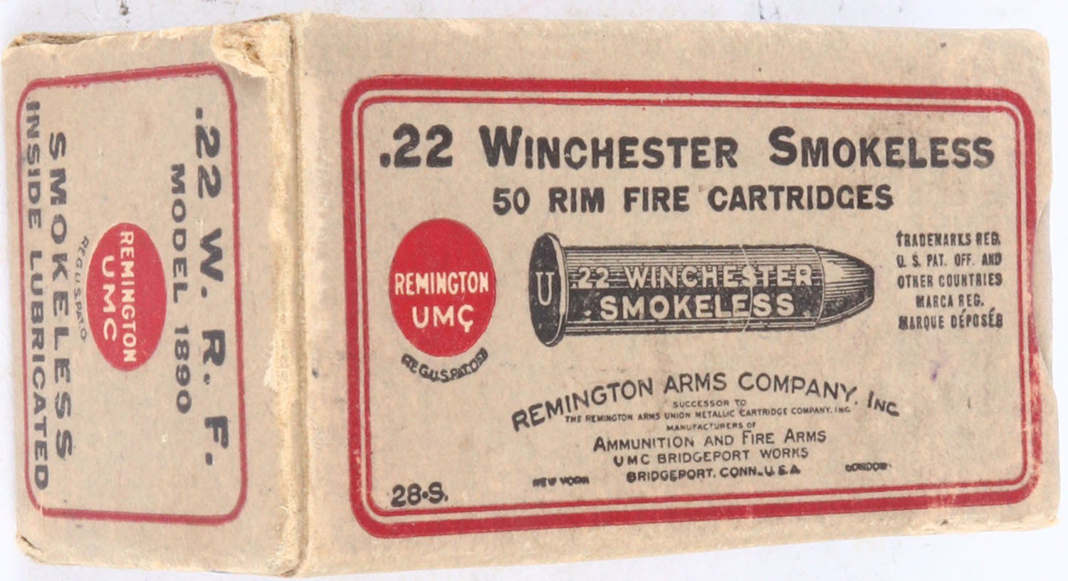 REM-UMC, .22 Winchester Rim Fire, Smokeless, RHWeb: REM-5 WRF-2a, Full, 1pc. Gray black and red box, box is solid with excellent color, minor shelf wear, some staining to front, some edge & corner wear, end flaps are solid, ammo is excellent. Grade: Excellent - Value: 20 to 100