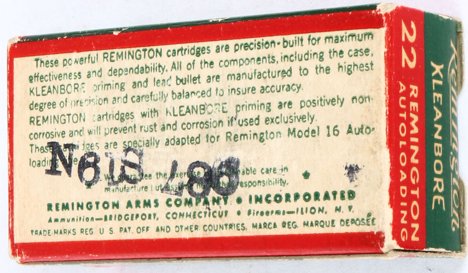 Remington, Kleanbore, .22 Remington Autoloading, RHWeb: REM-12 RA-1b, Partial 49rds., 1pc. Green white & red box, box is solid with excellent color, very minor edge & corner wear, end flaps are solid, ammo is excellent. Grade: Excellent + - Value: 50 to 150