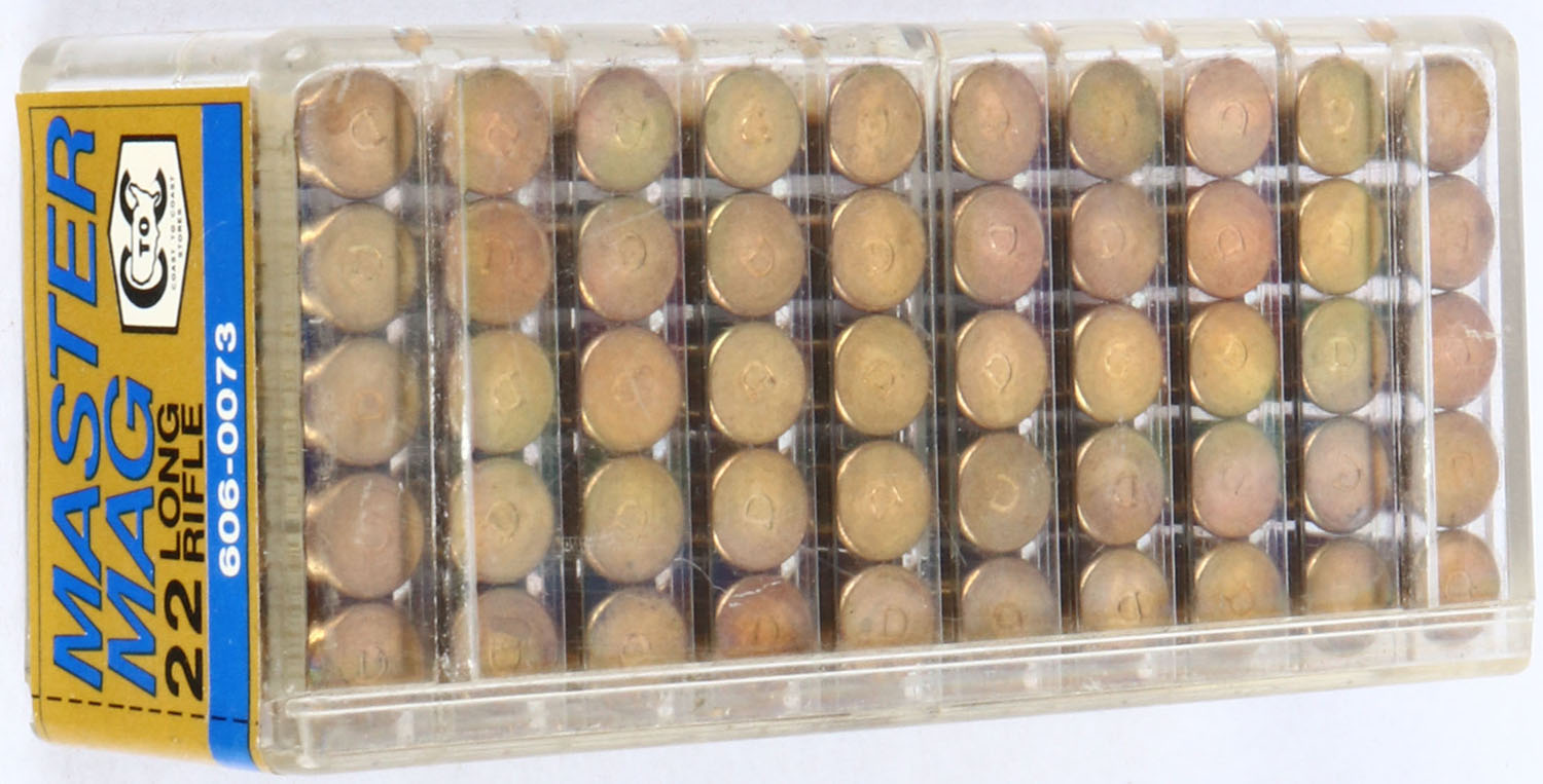 Coast to Coast, Master-Mag, .22 Long Rifle, High Velocity, RHWeb: CTC-2 LR-1.1, FULL & SEALED, 2pc. Clear plastic box with gold & blue side sealing label, box is solid with very minor shelf wear, label is intact with minty color. Grade: Excellent ++ - Value: 6 to 30