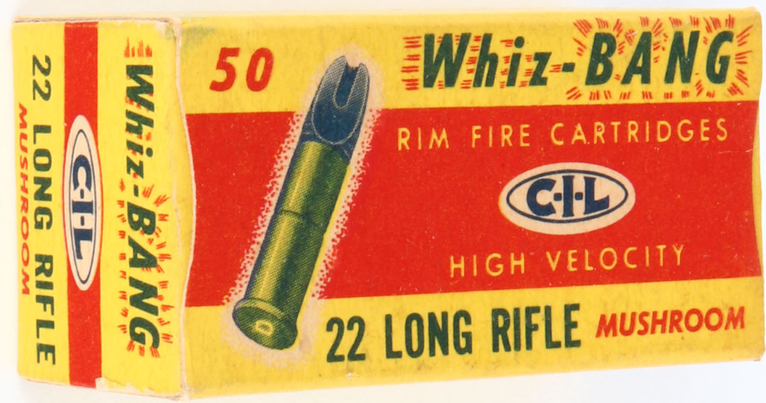 C.I.L., Whiz-Bang, .22 Long Rifle Mushroom, High Velocity, RHWeb: CIL-3 LR-2f, Full, 1pc. Yellow & red box, box is solid with excellent color, very minor age soiling, corners are mostly sharp, edges are crisp, end flaps are crisp, ammo is excellent. Grade: Excellent + - Value: 10 to 50