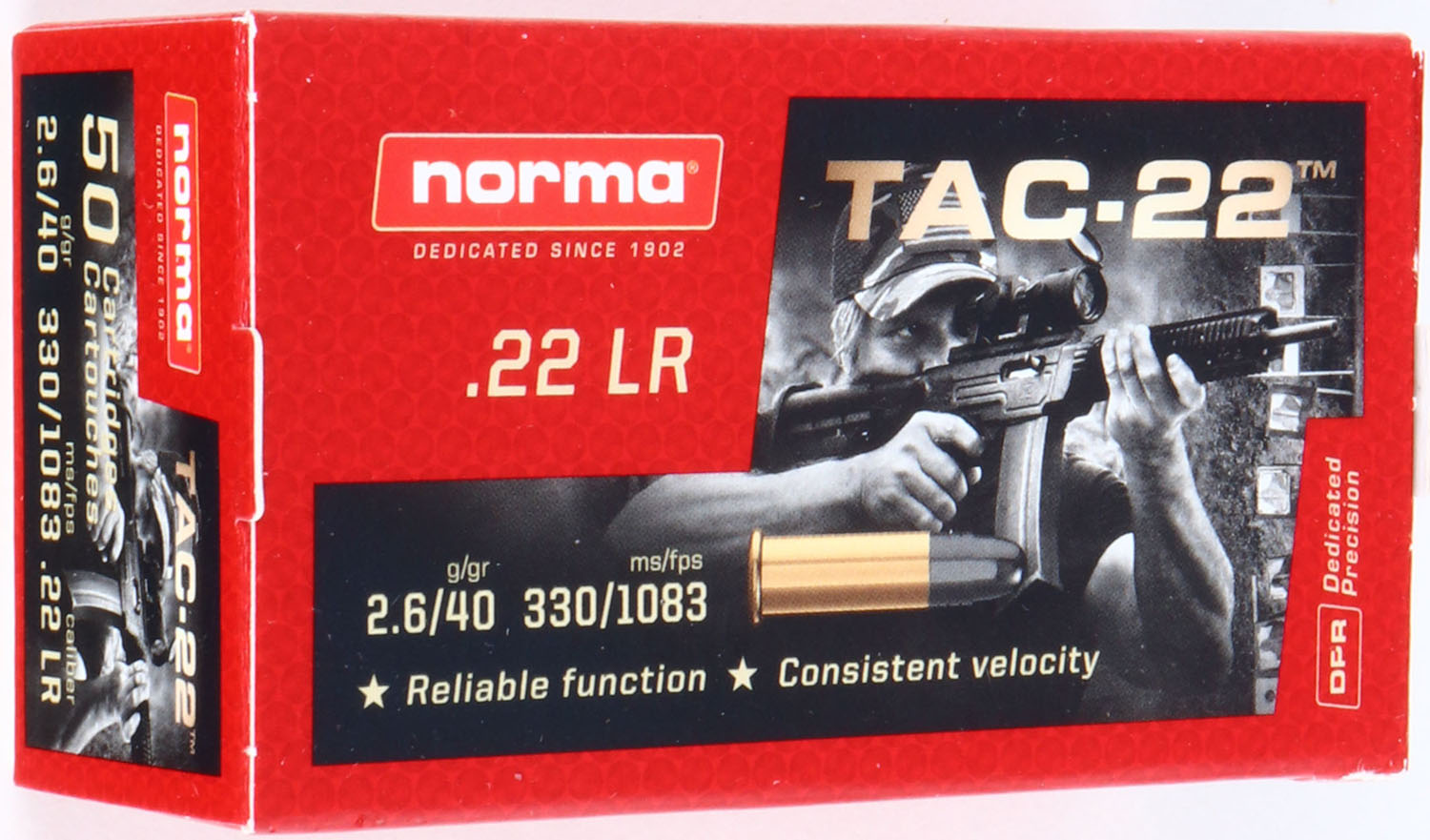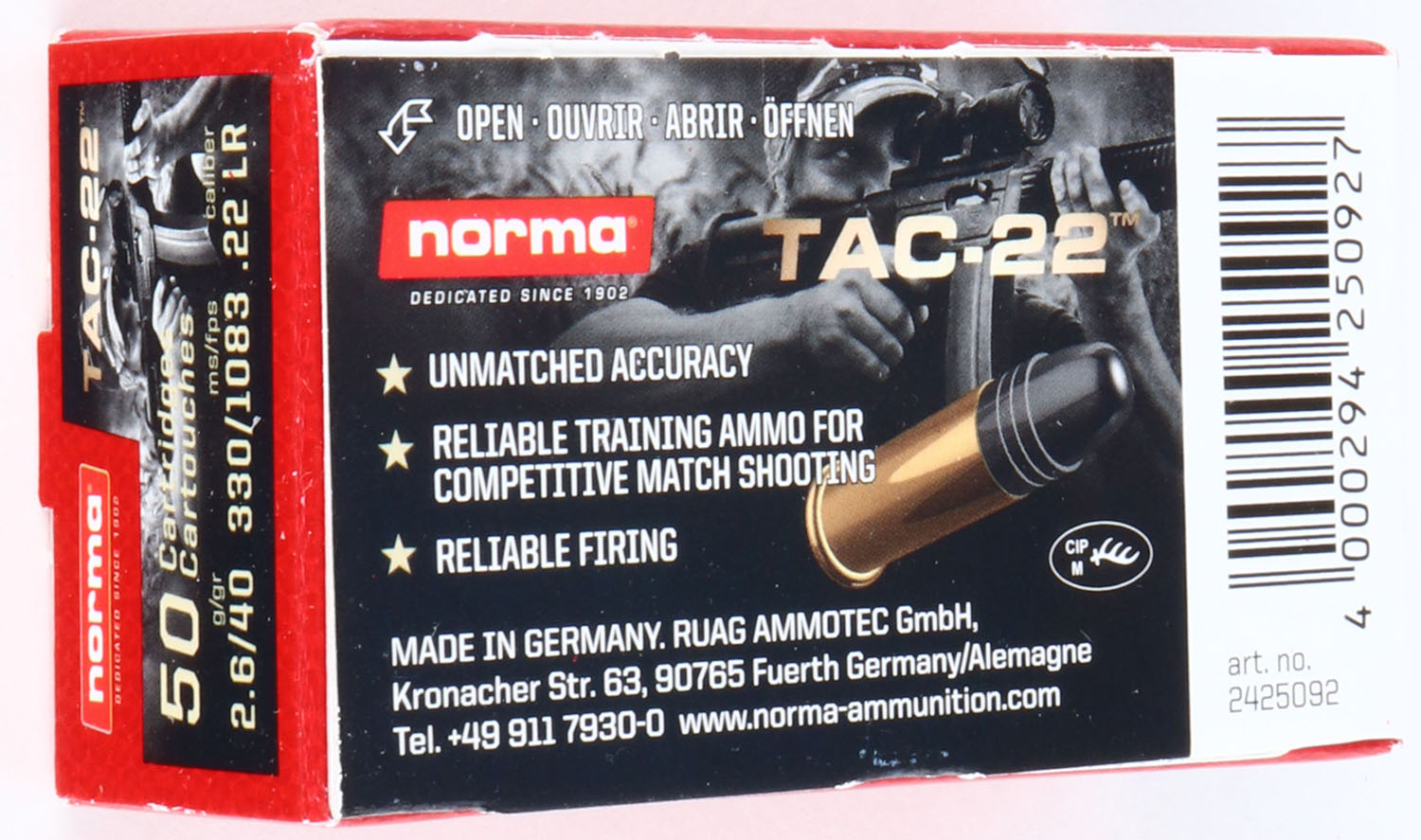 Norma, Tac-22, .22 Long Rifle, Lead Round Nose, 1083 FPS, Not in RHWeb, Full, 1pc. Red & black box, box is near mint with minty color, only very minor corner wear on top front corner, corners otherwise sharp, edges are crisp, end flaps are solid, ammo is minty. Grade: Excellent ++ - Value: 10 to 50