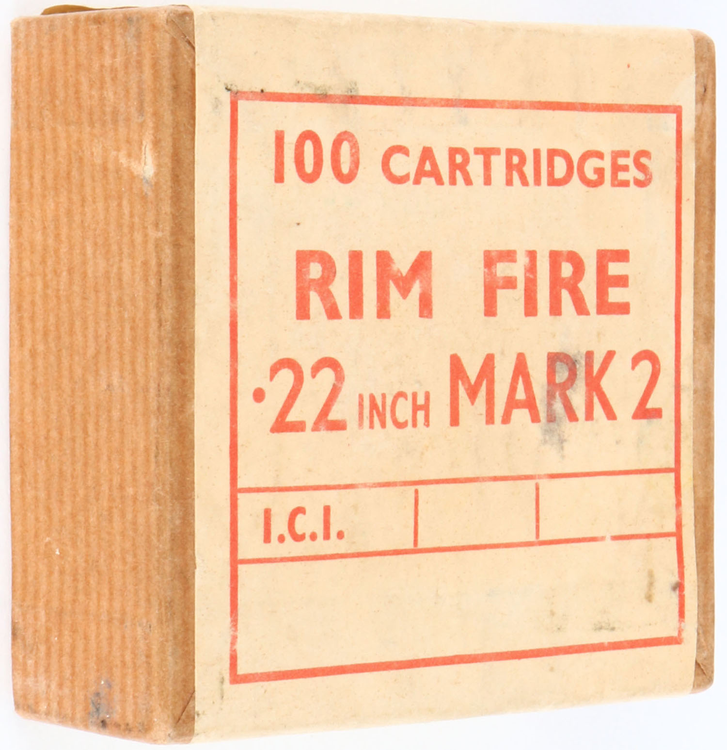 I.C.I., Mark 2, .22 Long Rifle, RHWeb: ICI-6 LR-6, FULL & SEALED, 2pc. Buff box with white & red wraparound label, box is solid with very good color, age soiling, minor staining, very minor corner wear, edges are crisp, label is intact. Grade: Excellent - Value: 10 to 40