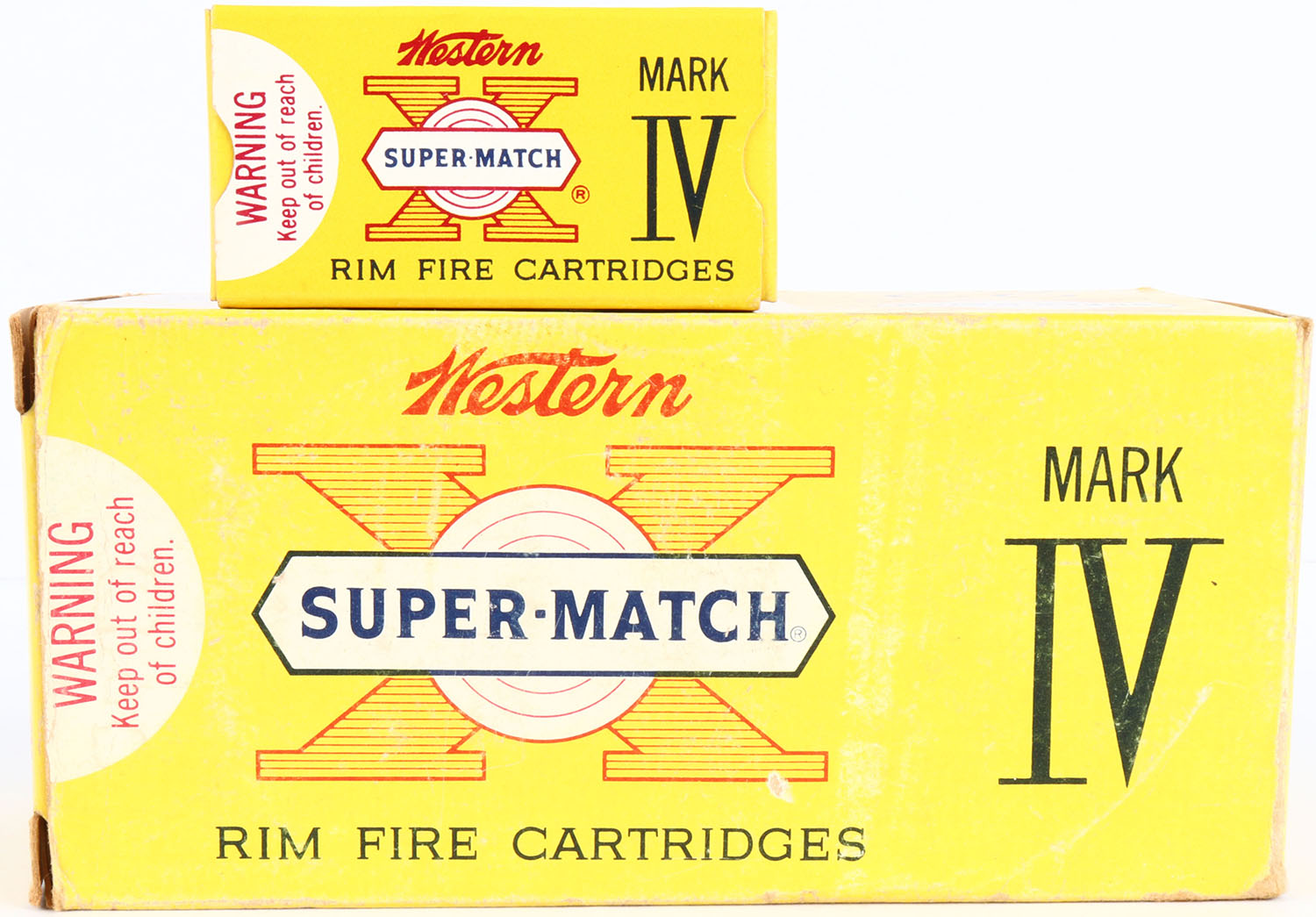 Western, Super-Match Mark IV, .22 Long Rifle, Special Match Bullet, Full, 500rds. 1pc. Yellow white & red brick, brick is solid with very good color, some color fading, some edge & corner wear, end flaps are solid, inside boxes are mint. Grade: Excellent - Value: 50 to 150