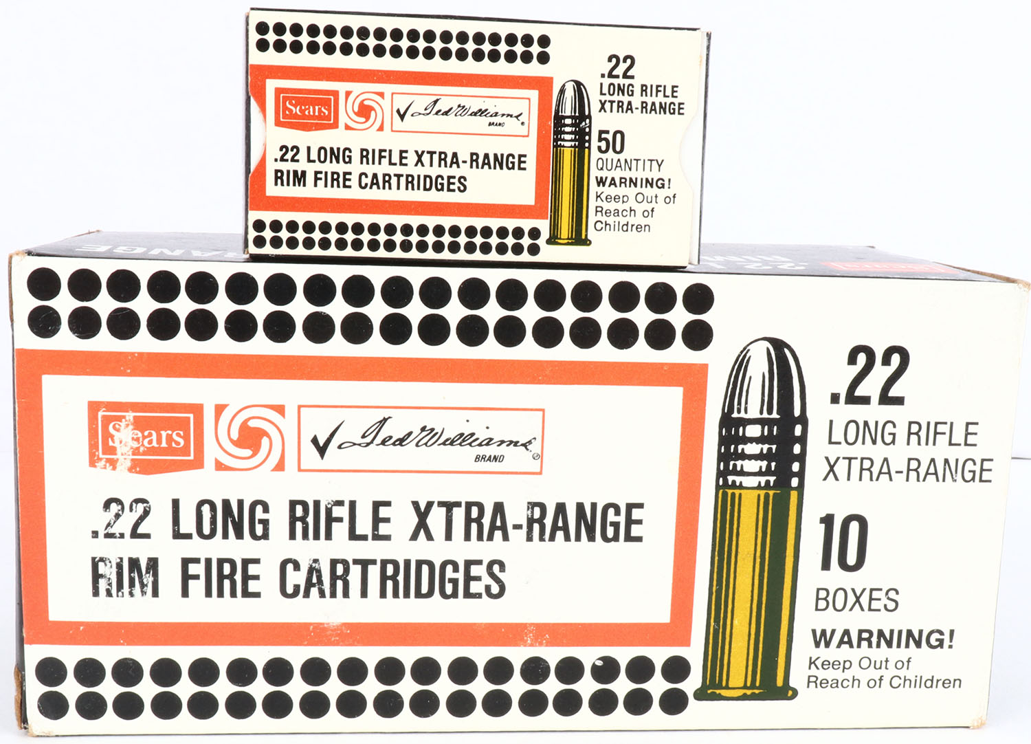 Sears, Xtra-Range, .22 Long Rifle, Full, 500rds. 1pc. White black & red brick, brick is solid with excellent color, minor shelf wear, very minor corner wear, edges are crisp, end flaps are solid, inside boxes are minty. Grade: Excellent ++ - Value: 50 to 200
